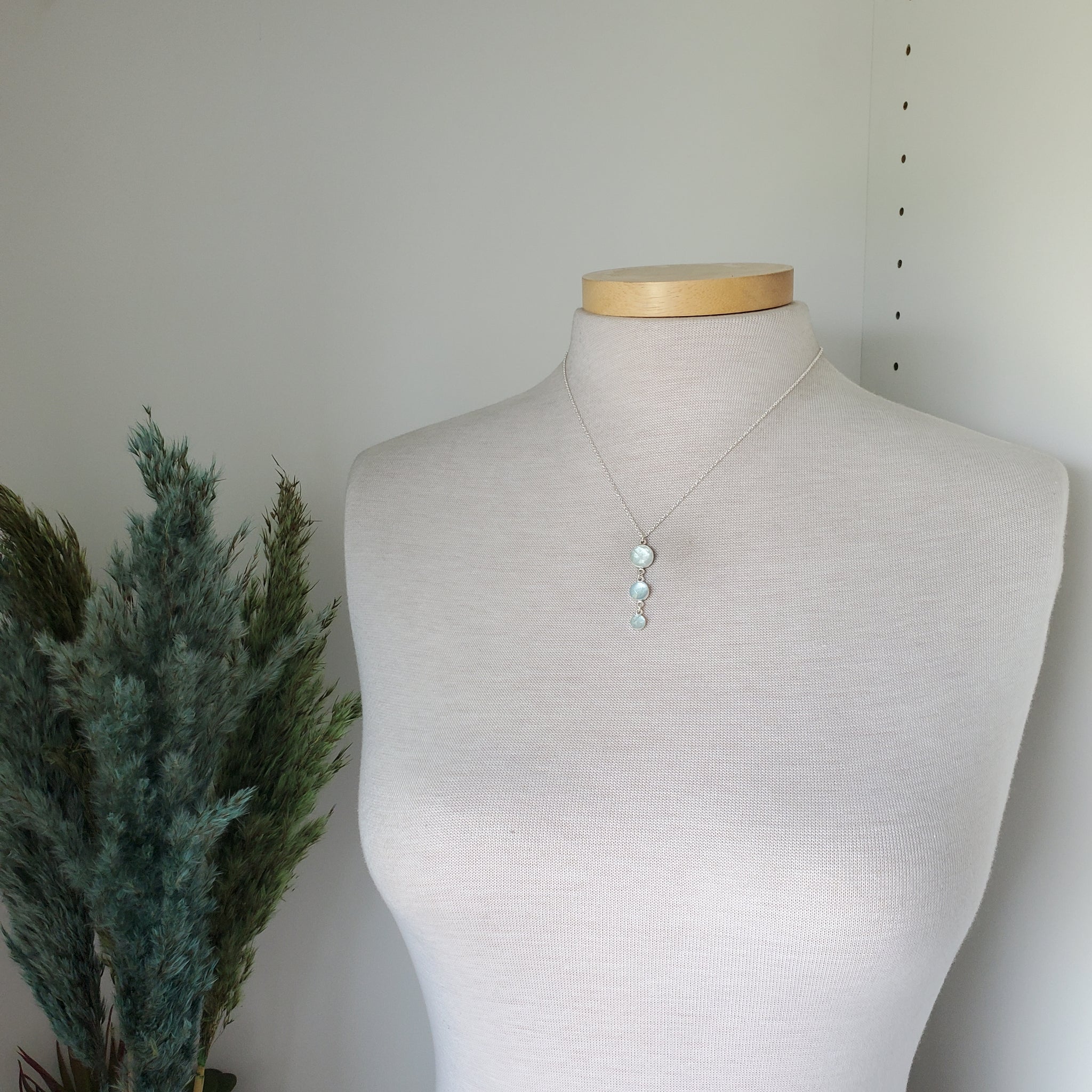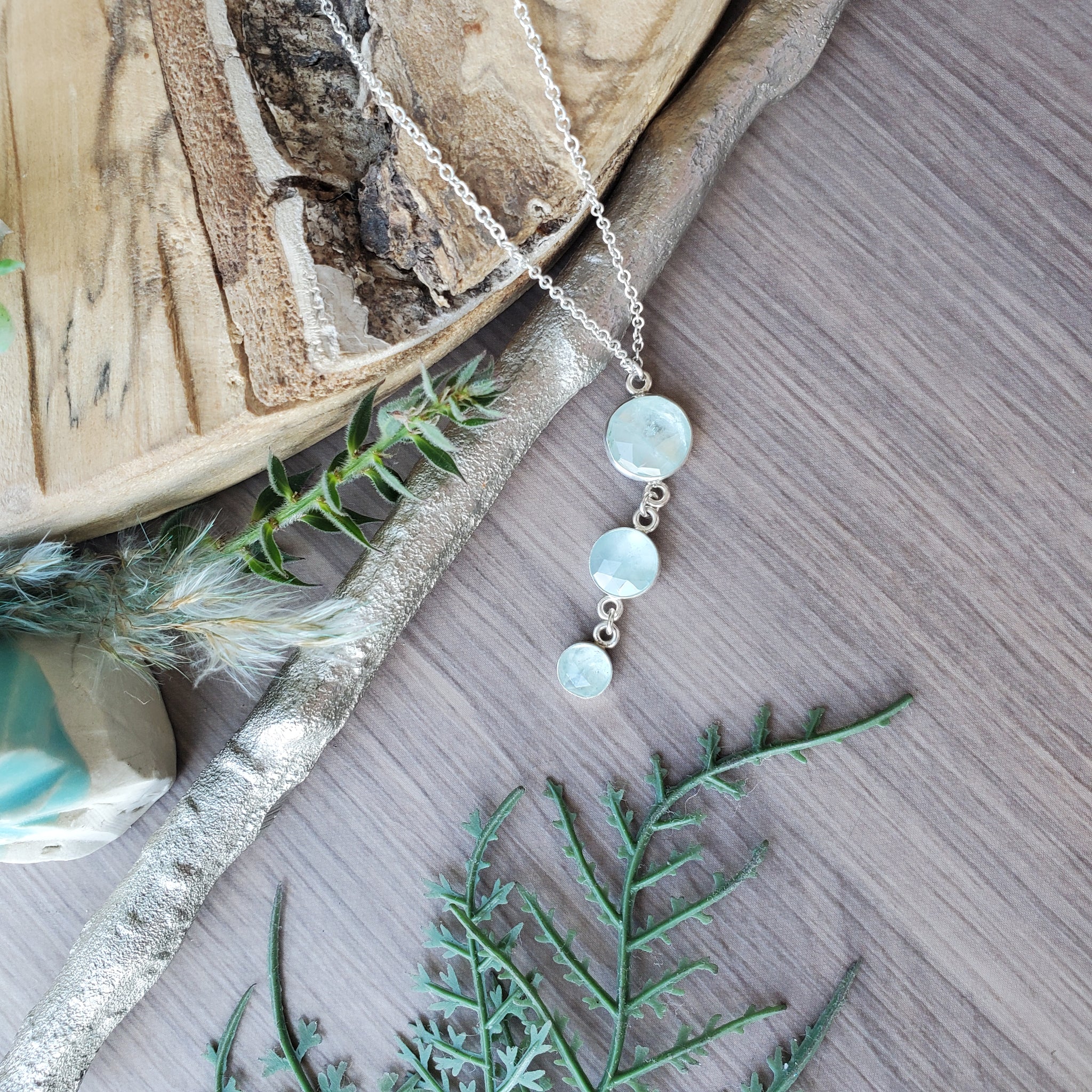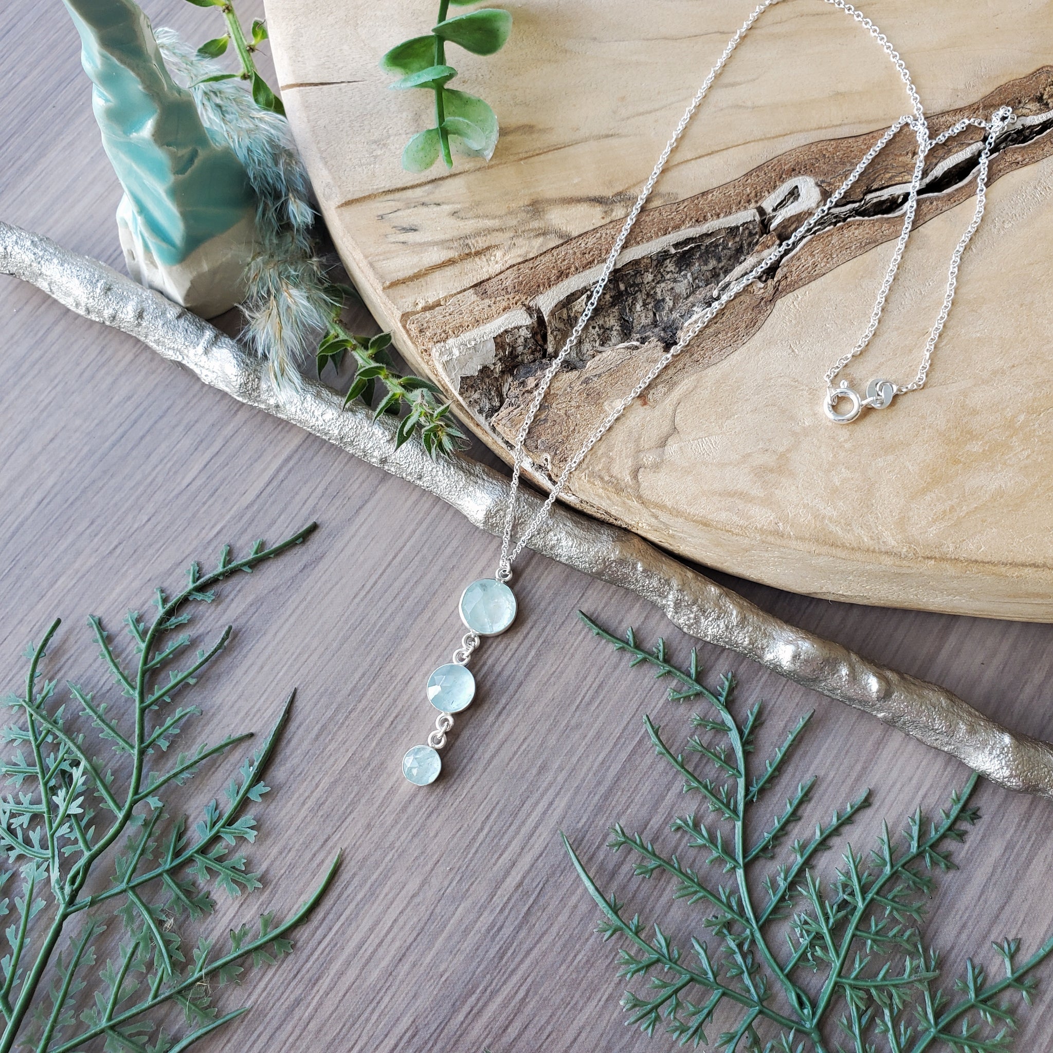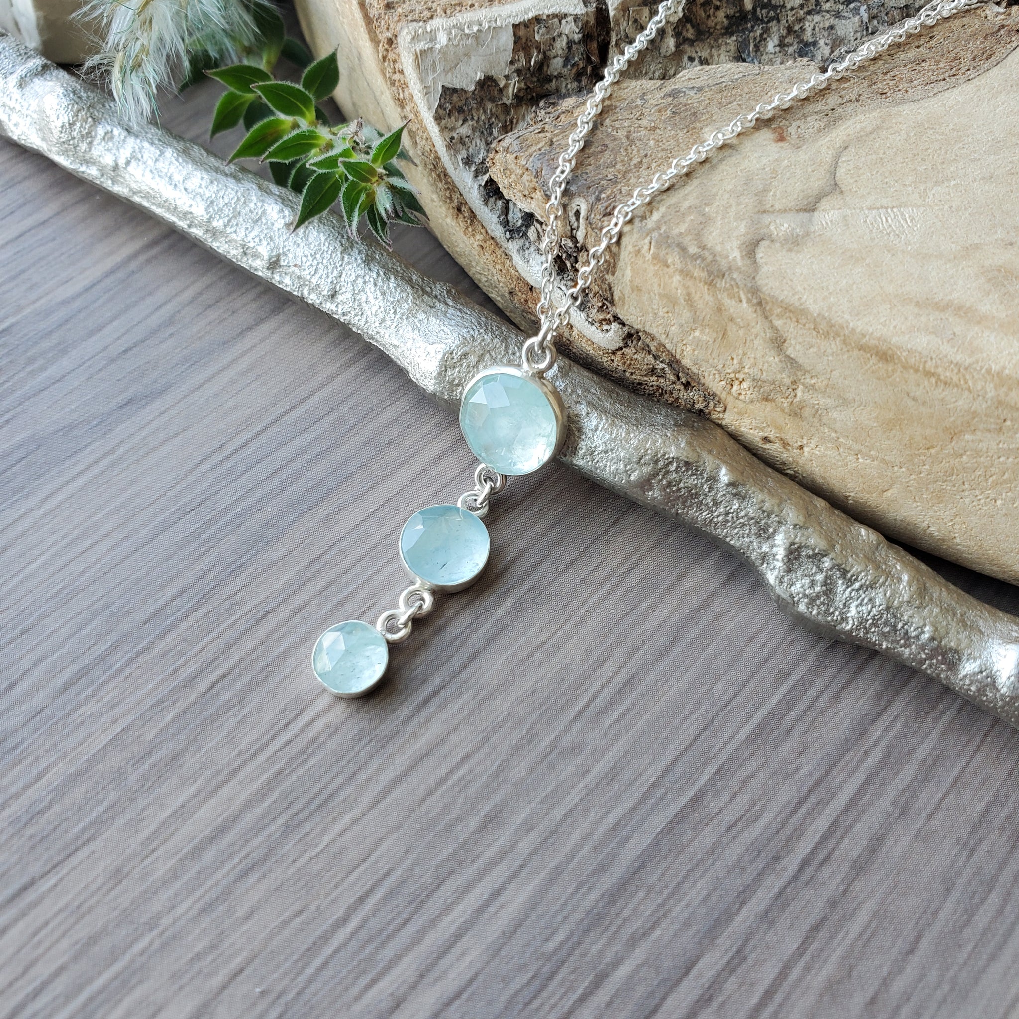 This aquamarine necklace features a stunning faceted aquamarine pendant that adds elegant blue tones to any outfit. Crafted with a sterling silver necklace chain, this natural stone jewelry piece showcases three genuine aquamarine gemstones measuring 10mm, 8mm, and 6mm, set on a solid-backed 41mm pendant. The aquamarine necklace is designed to bring a calming and refreshing look while offering durability and timeless style. Each birthstone necklace gift is handmade in Manitoba, Canada, ensuring a unique piece with slight variations in size and texture due to the natural stones.