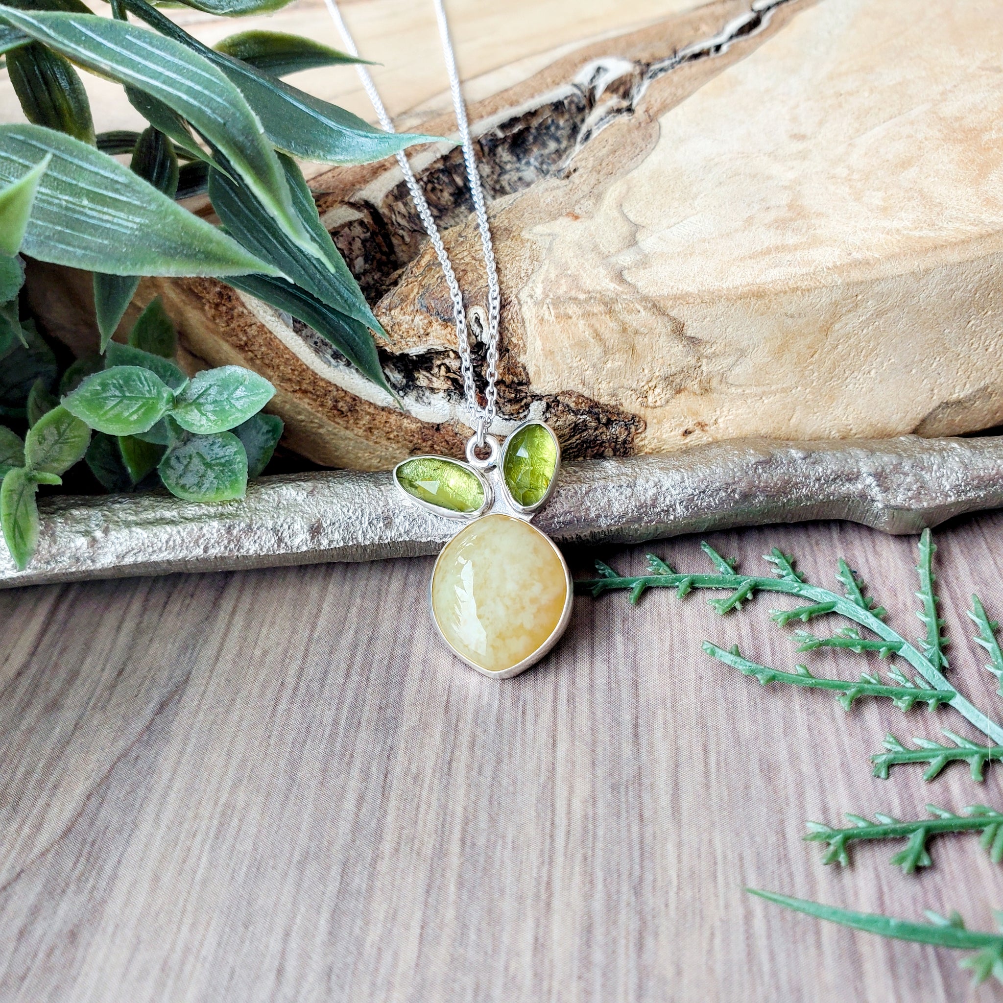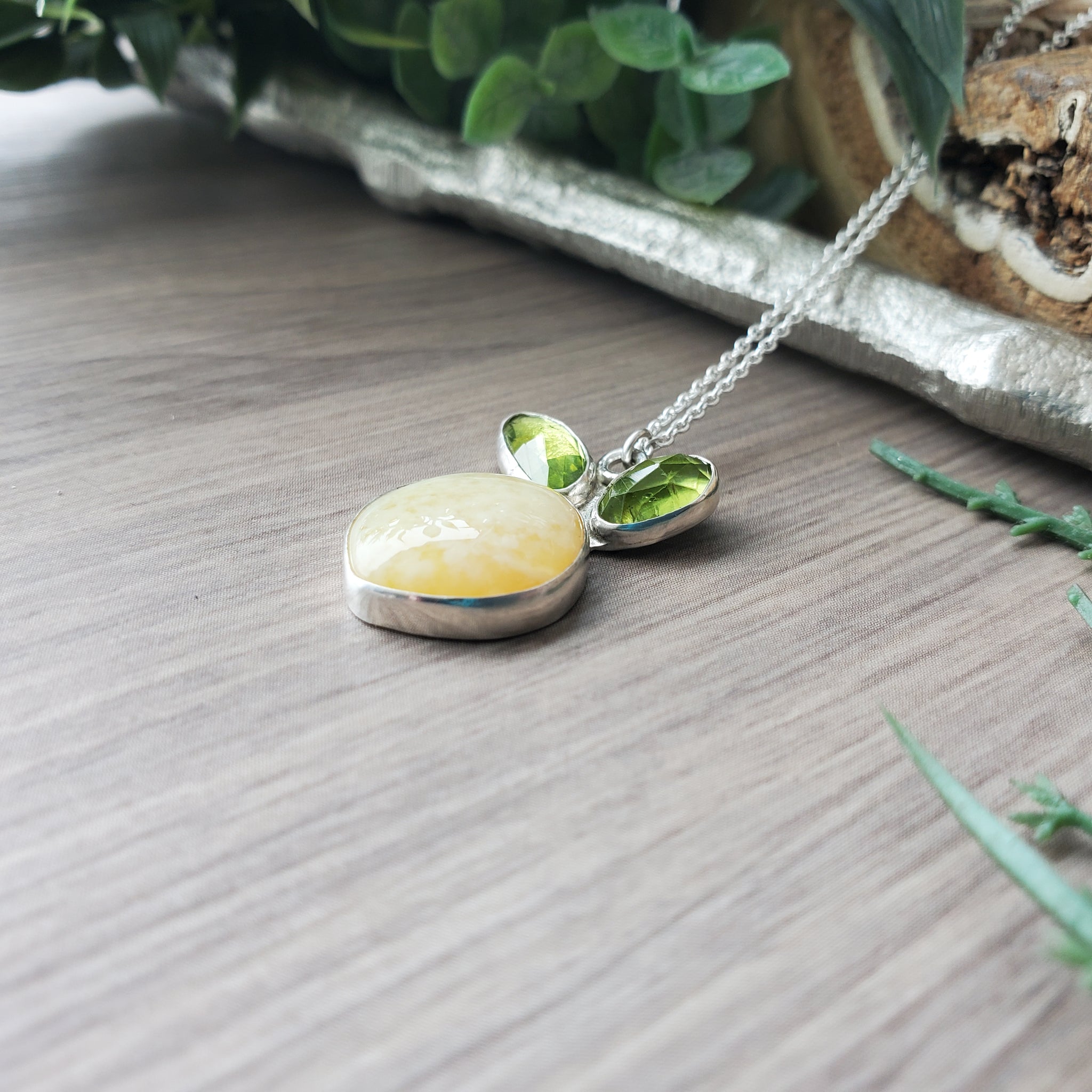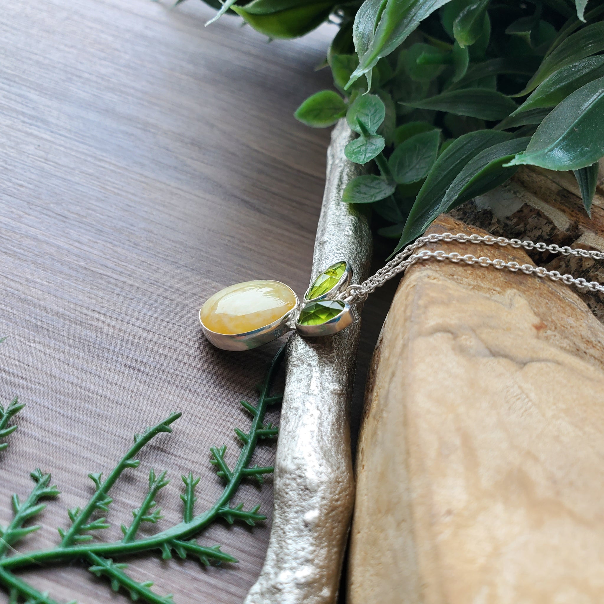 A large Lemon Quartz and Peridot gemstones set in a Sterling Silver 26x18mm Lemon Pendant hung on a Sterling Silver Chain Necklace.