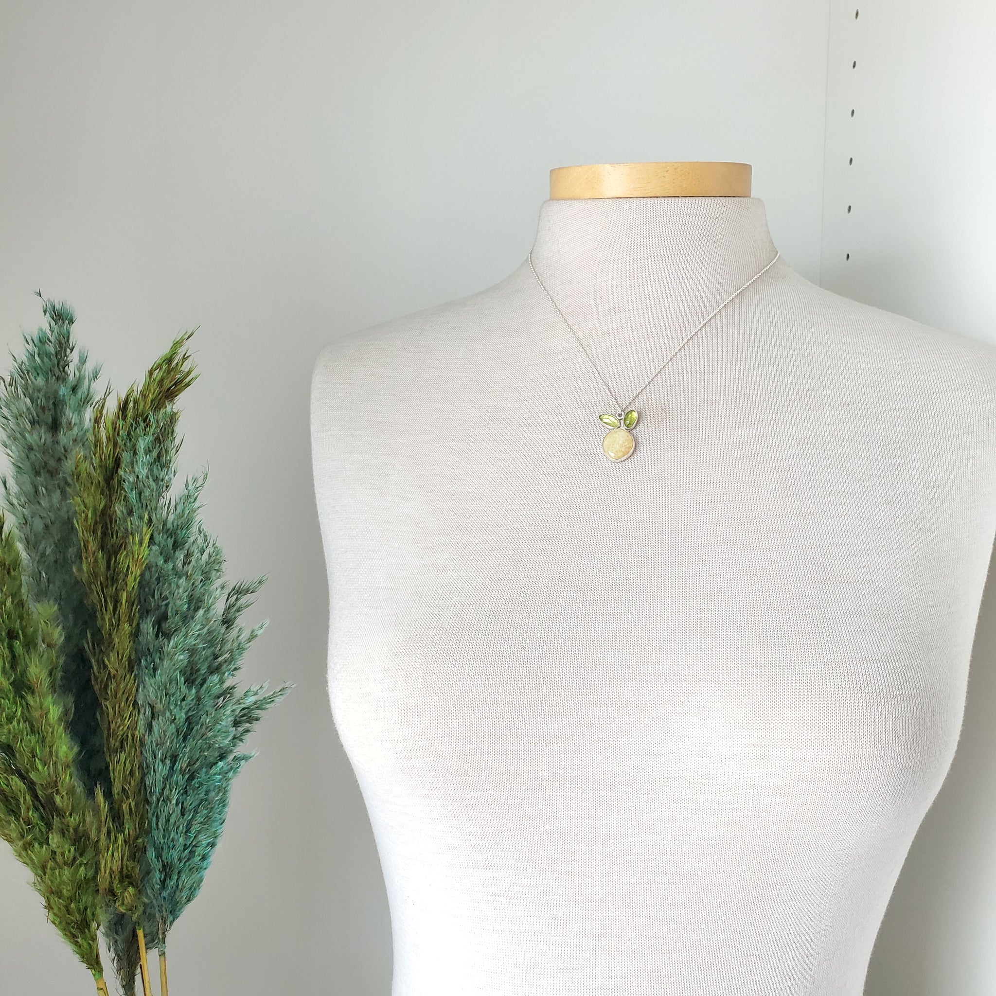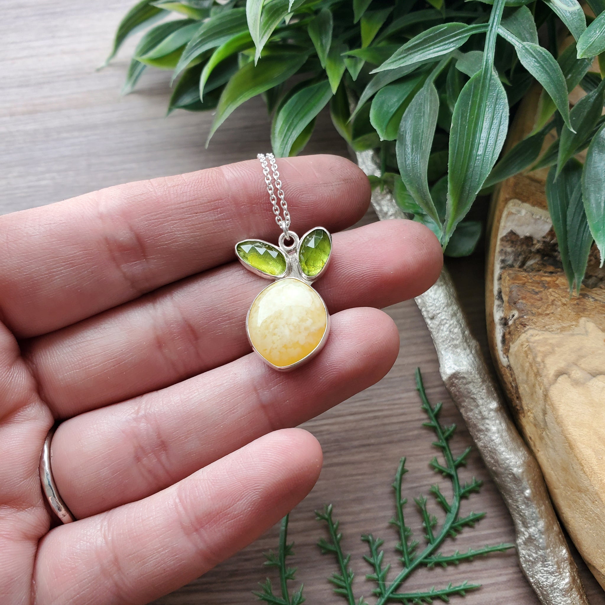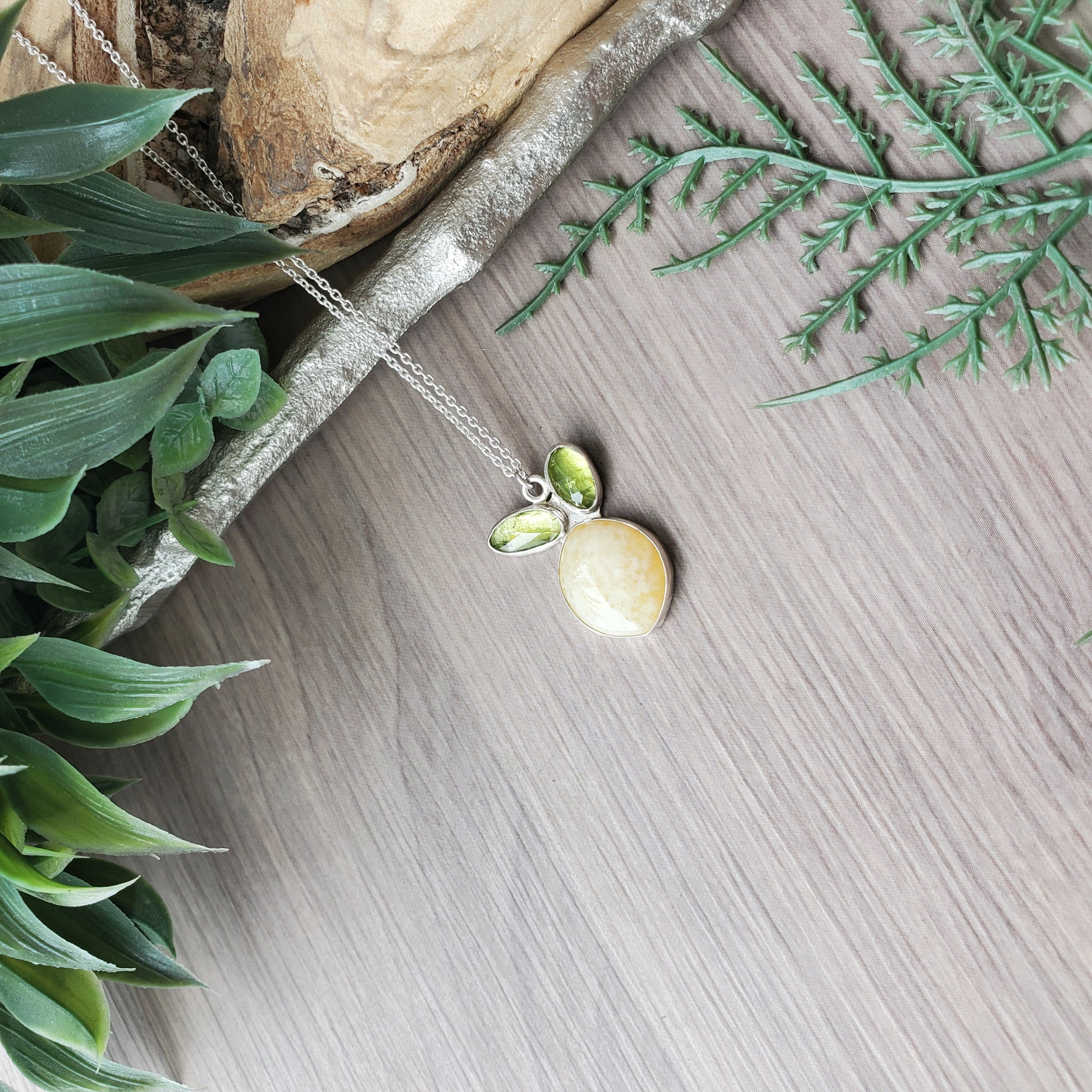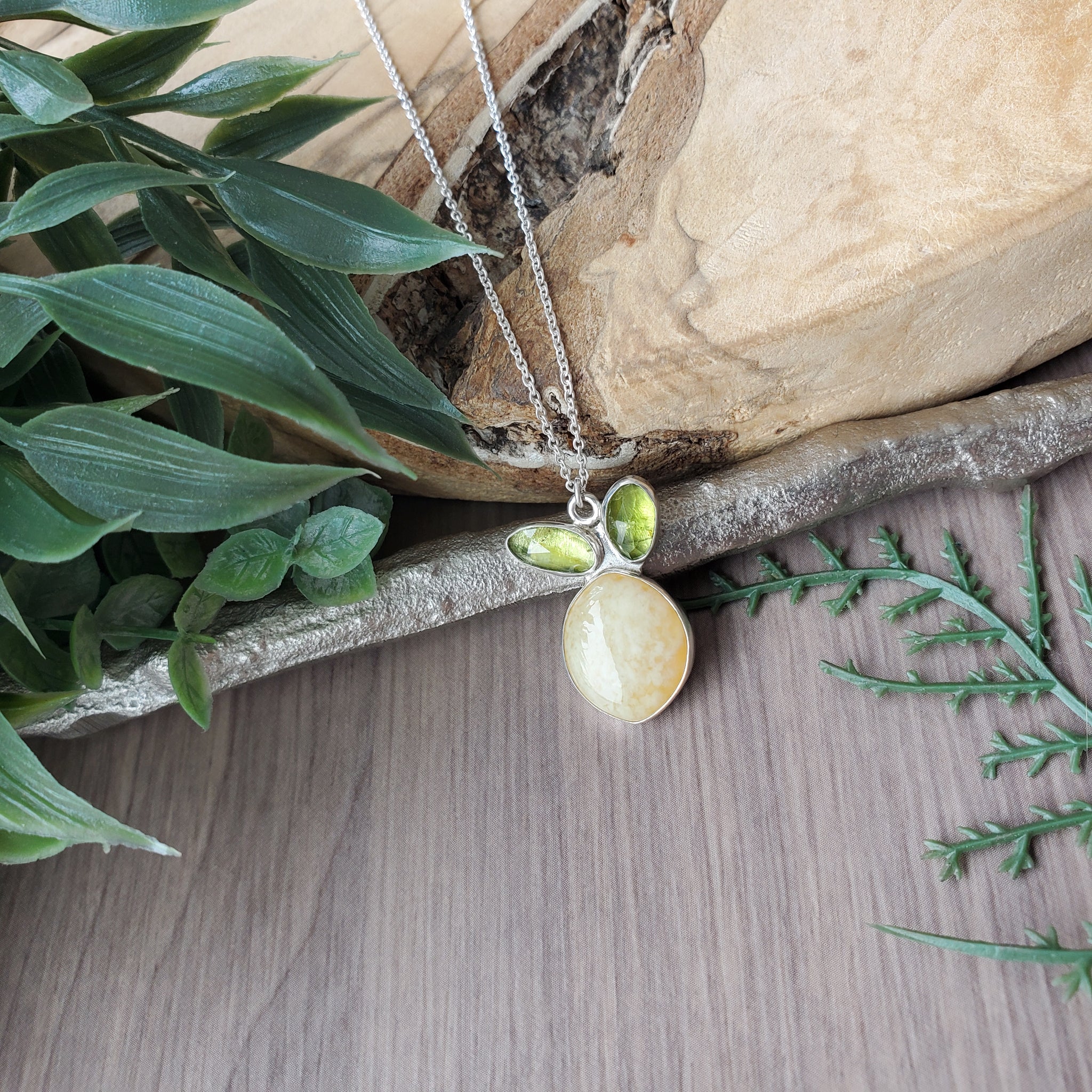 A large Lemon Quartz and Peridot gemstones set in a Sterling Silver 26x18mm Lemon Pendant hung on a Sterling Silver Chain Necklace.
