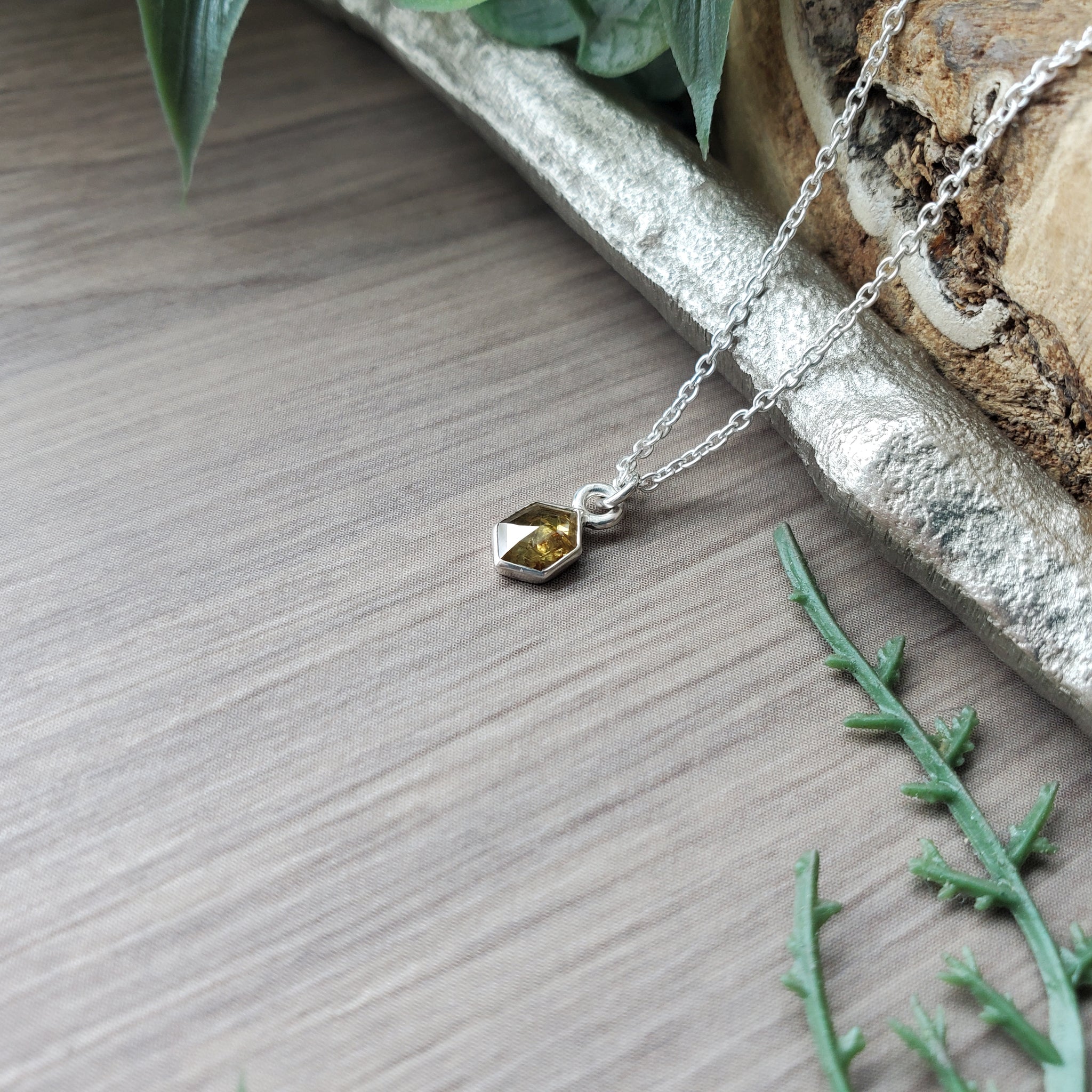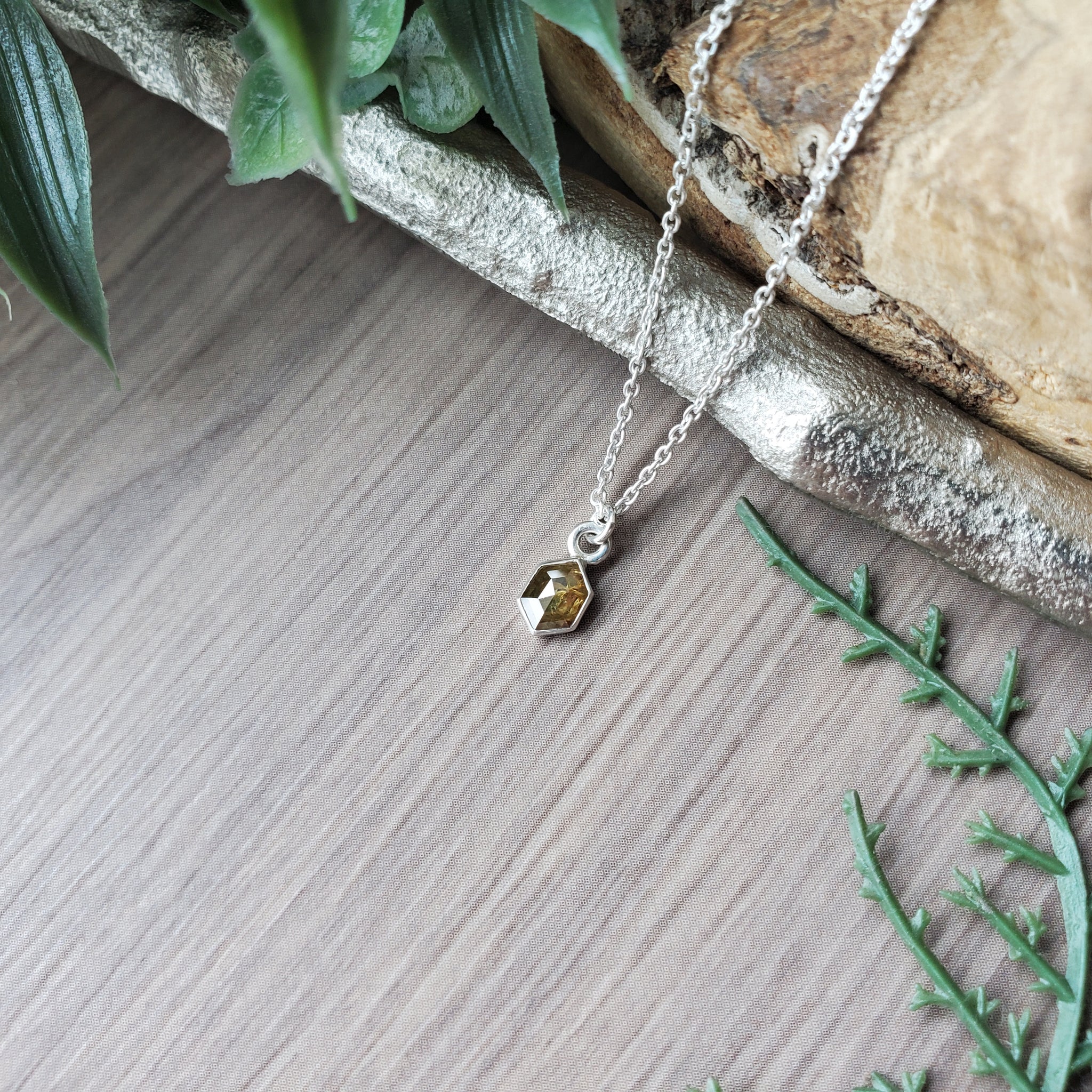 A natural 6x4.2mm Salt and Pepper Yellow Diamond, mounted in a 9x4.5mm sterling silver setting on a sterling silver chain.