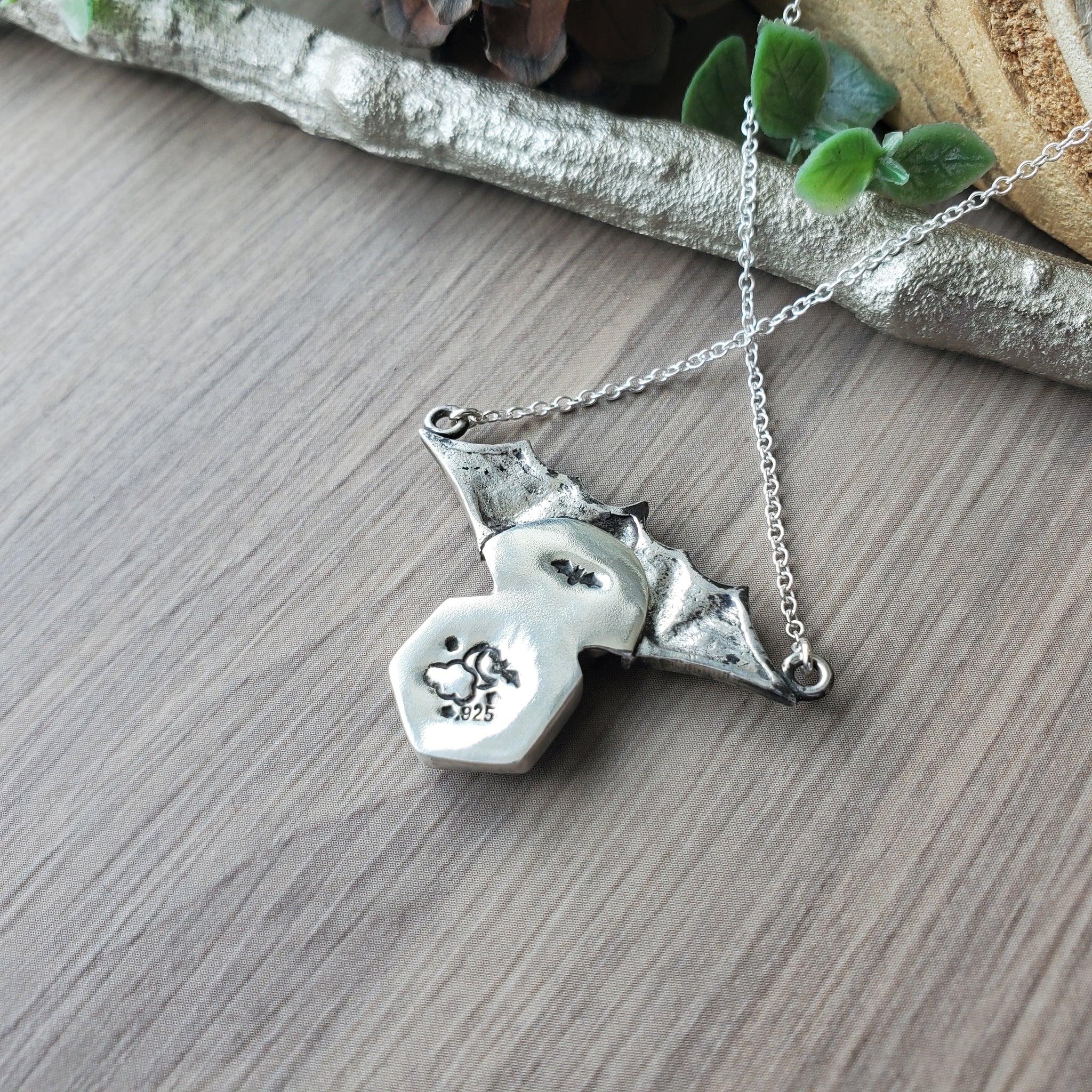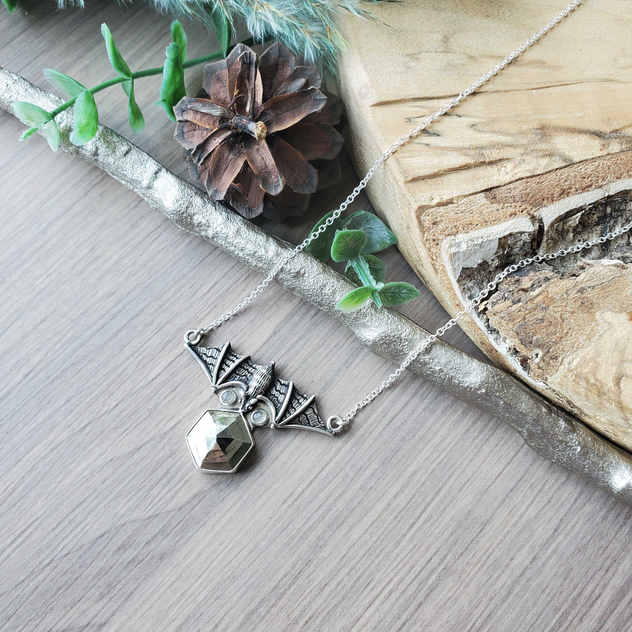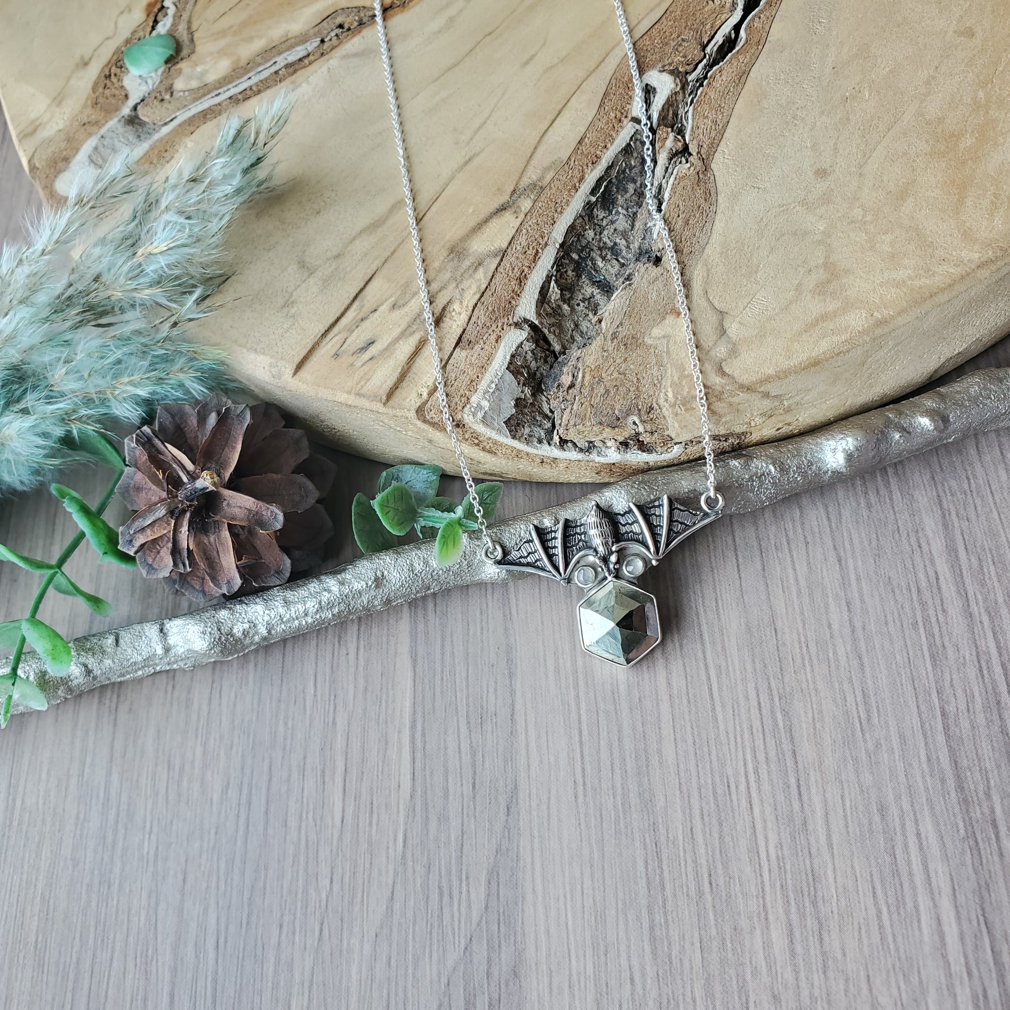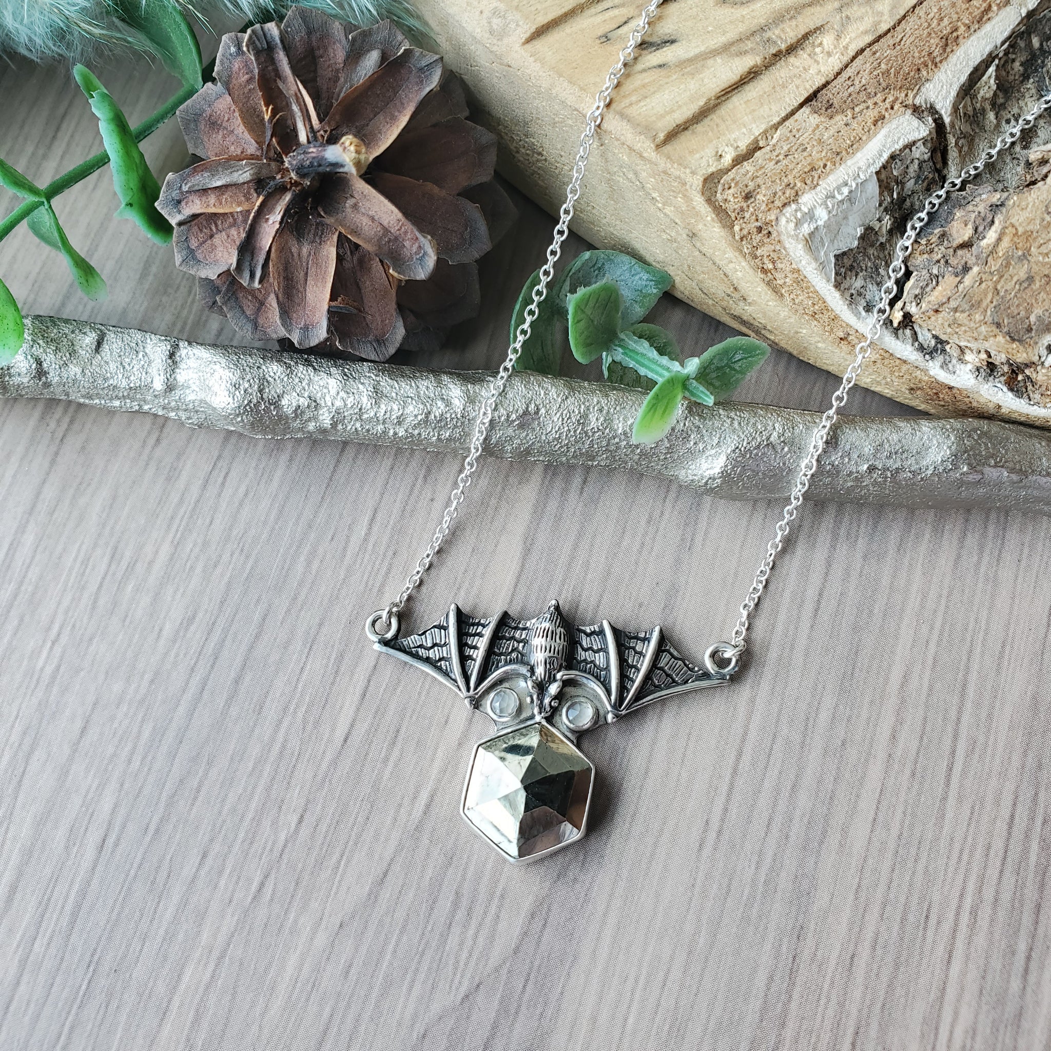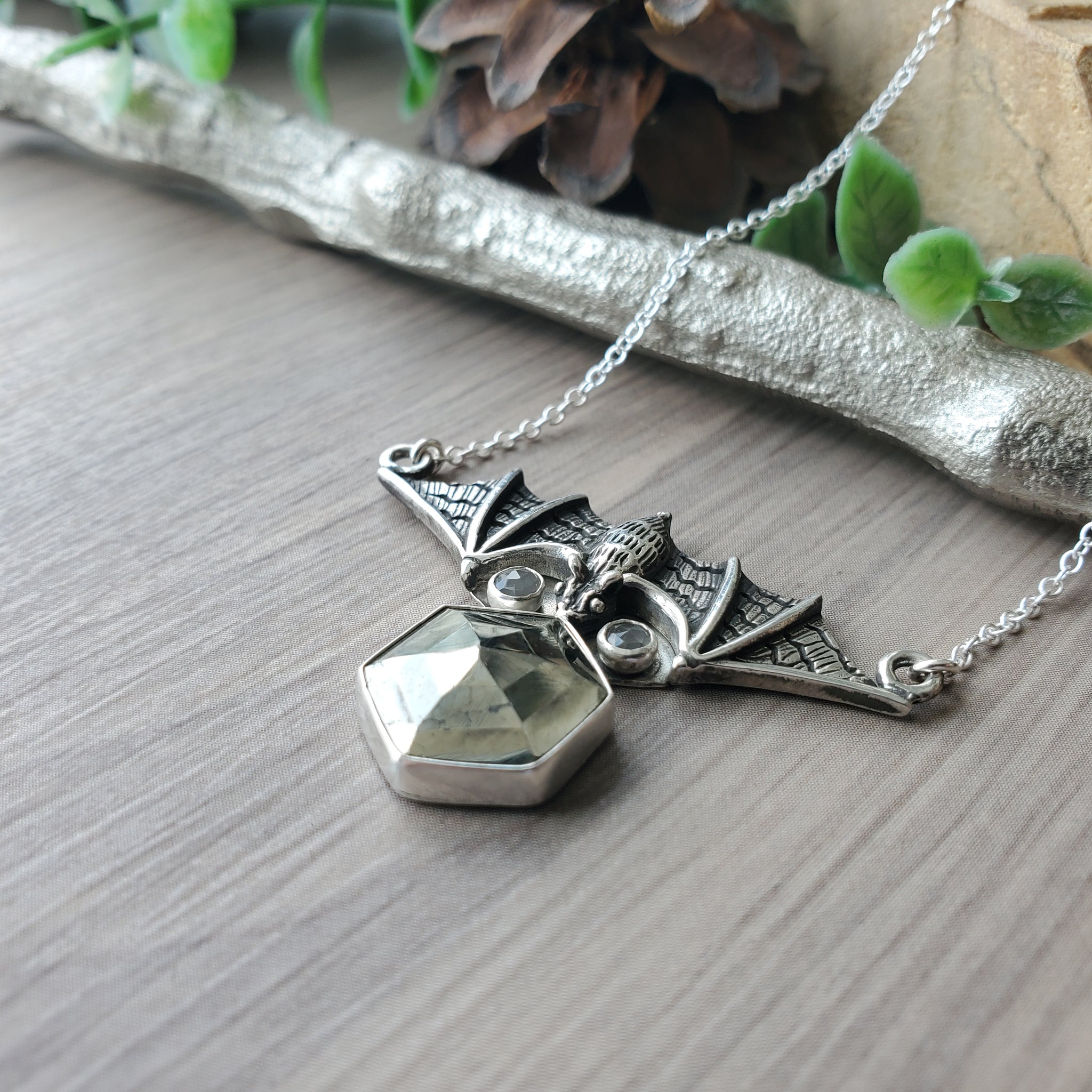 A 40x28mm Sterling Silver Bat pendant accented with a faceted hexagon Pyrite accented with 3mm faceted Grey Moonstones hung on a Sterling Silver chain.