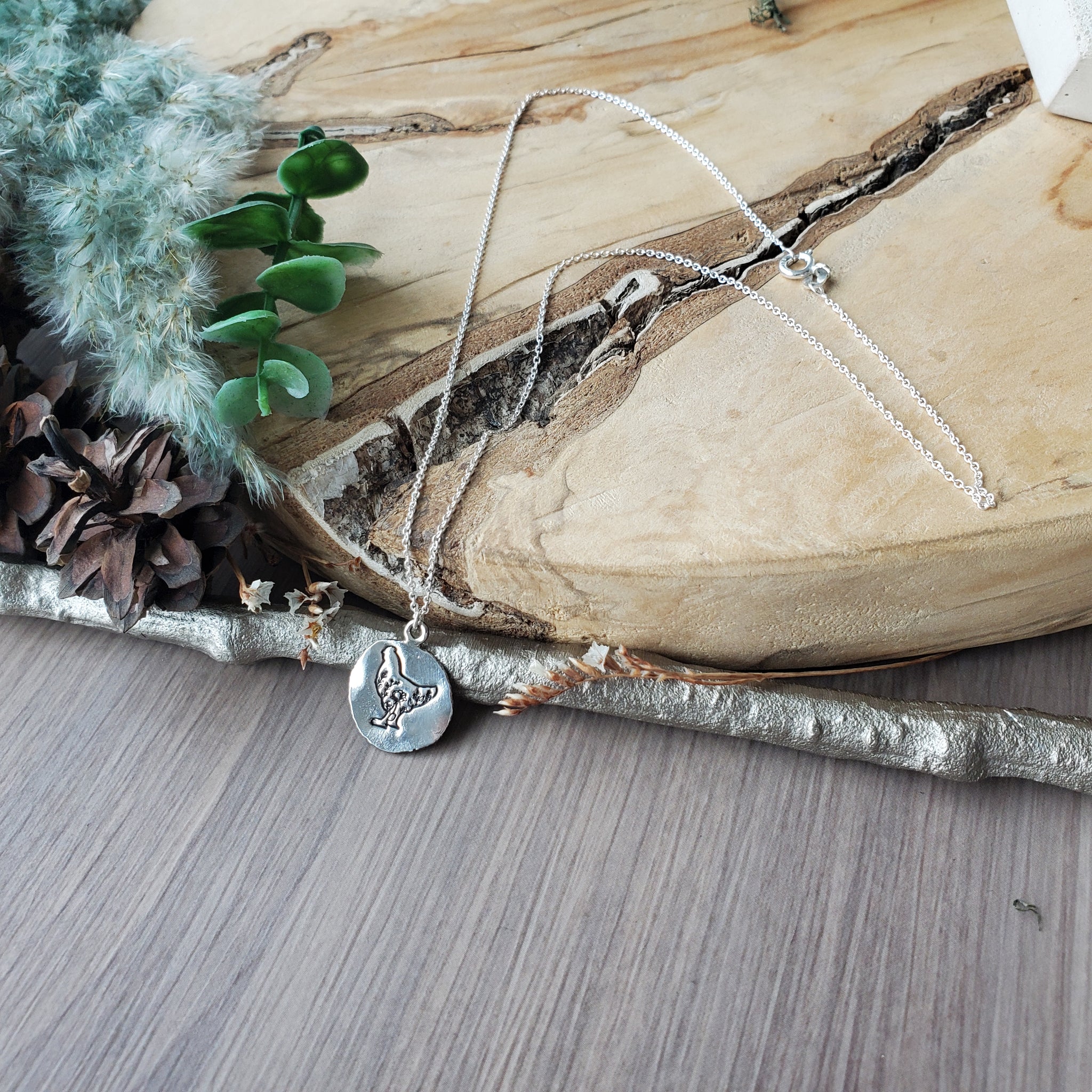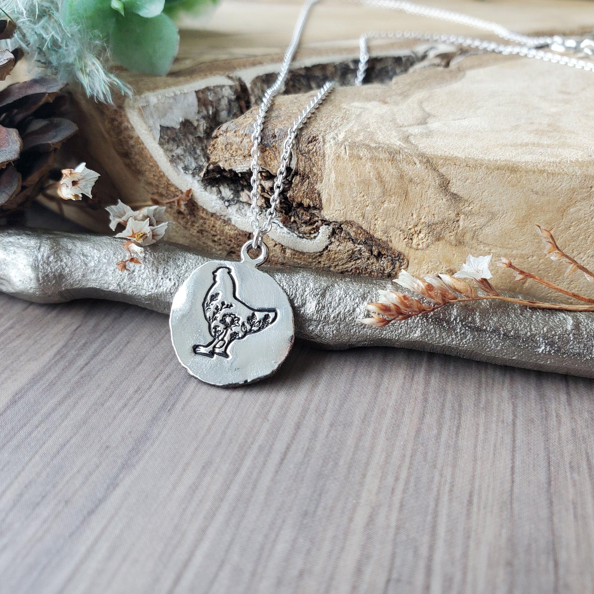 This floral chicken necklace features a hand-stamped floral chicken pendant crafted from upcycled hammered sterling silver, measuring approximately 20x16mm. Designed for chicken lovers, this sterling silver necklace offers a unique blend of rustic charm and modern style, making it the perfect personalized chicken jewelry piece to wear daily or gift to a farm animal enthusiast. The floral chicken necklace delivers a minimalist bird necklace aesthetic while celebrating your love for hens with a silver hammered pendant that stands out.