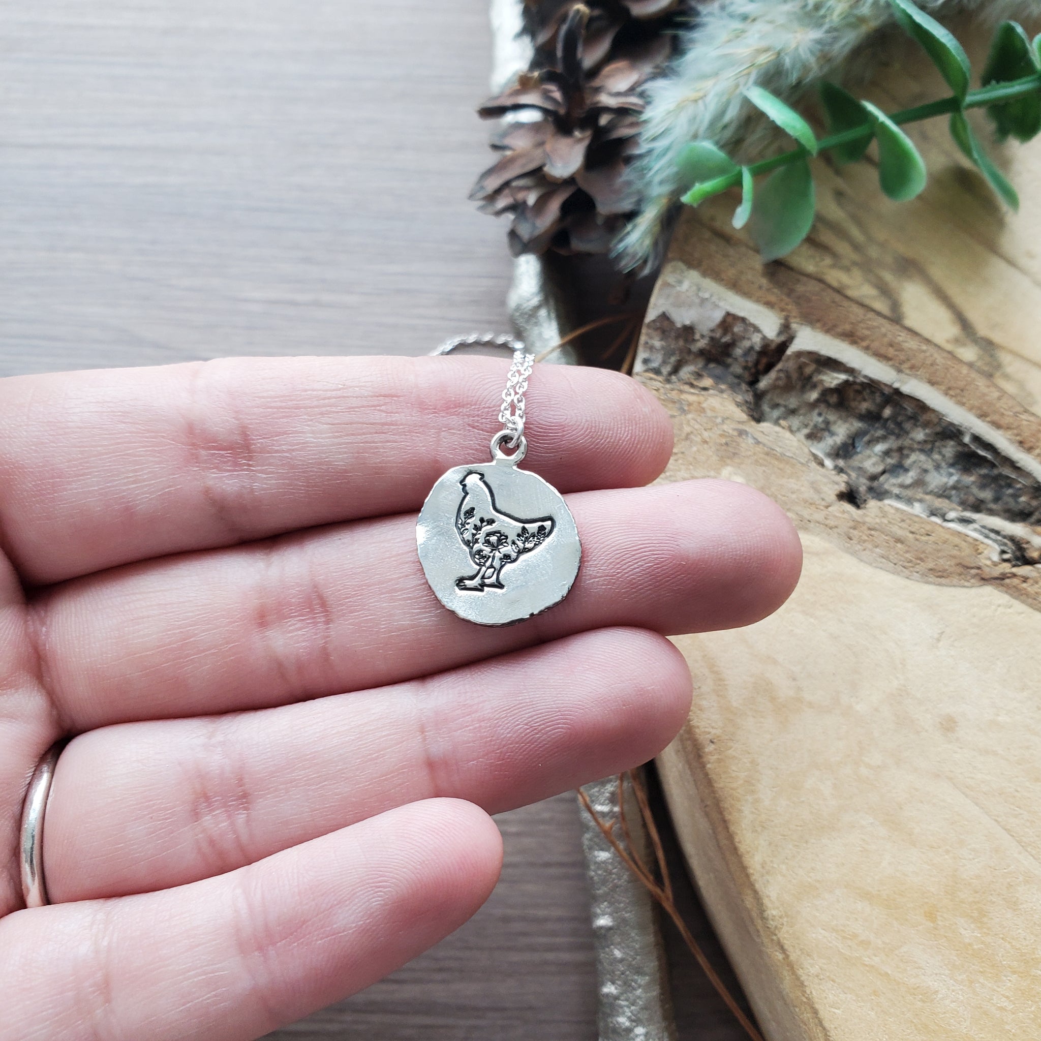 - Hand stamped pendant with detailed floral chicken design → unique and meaningful jewelry