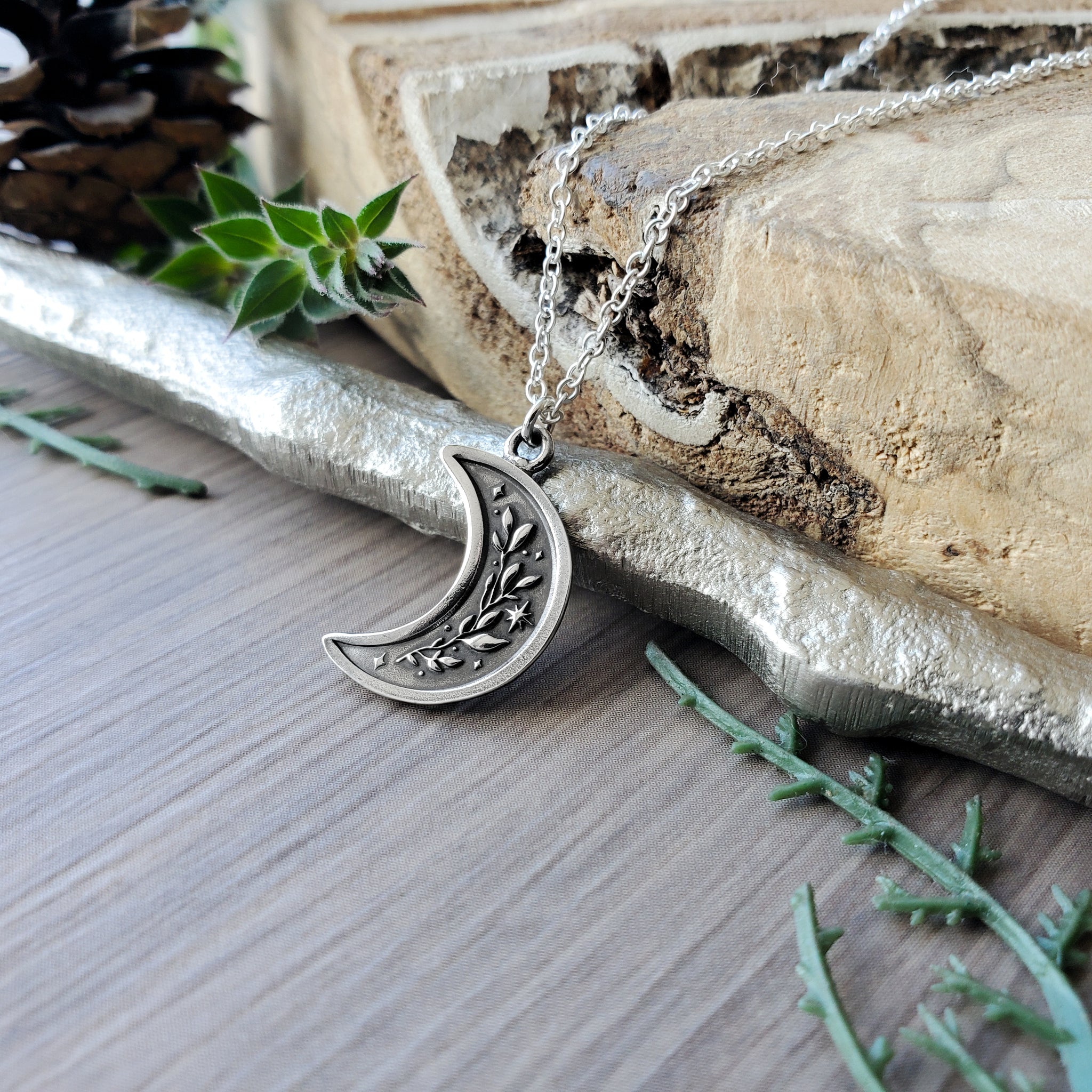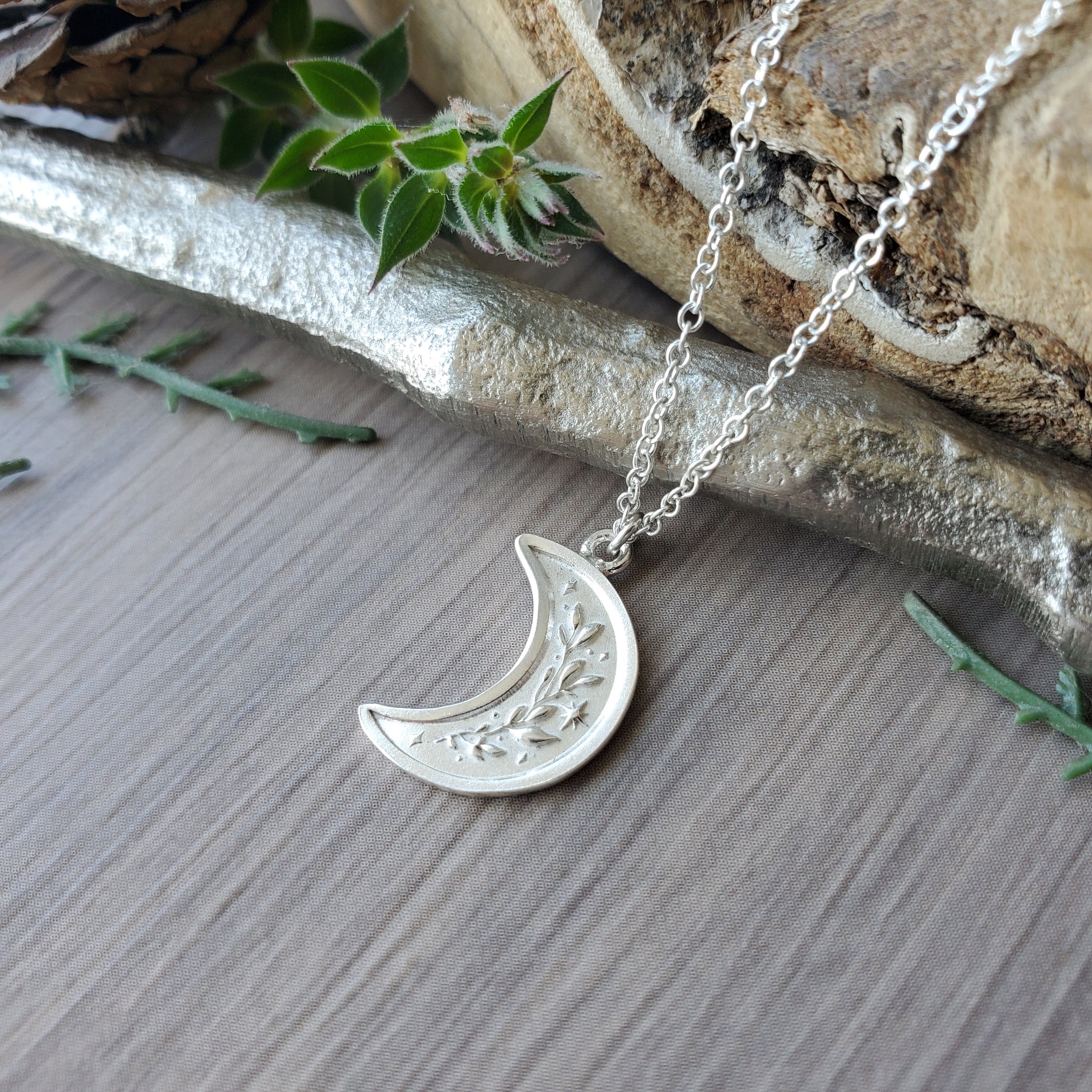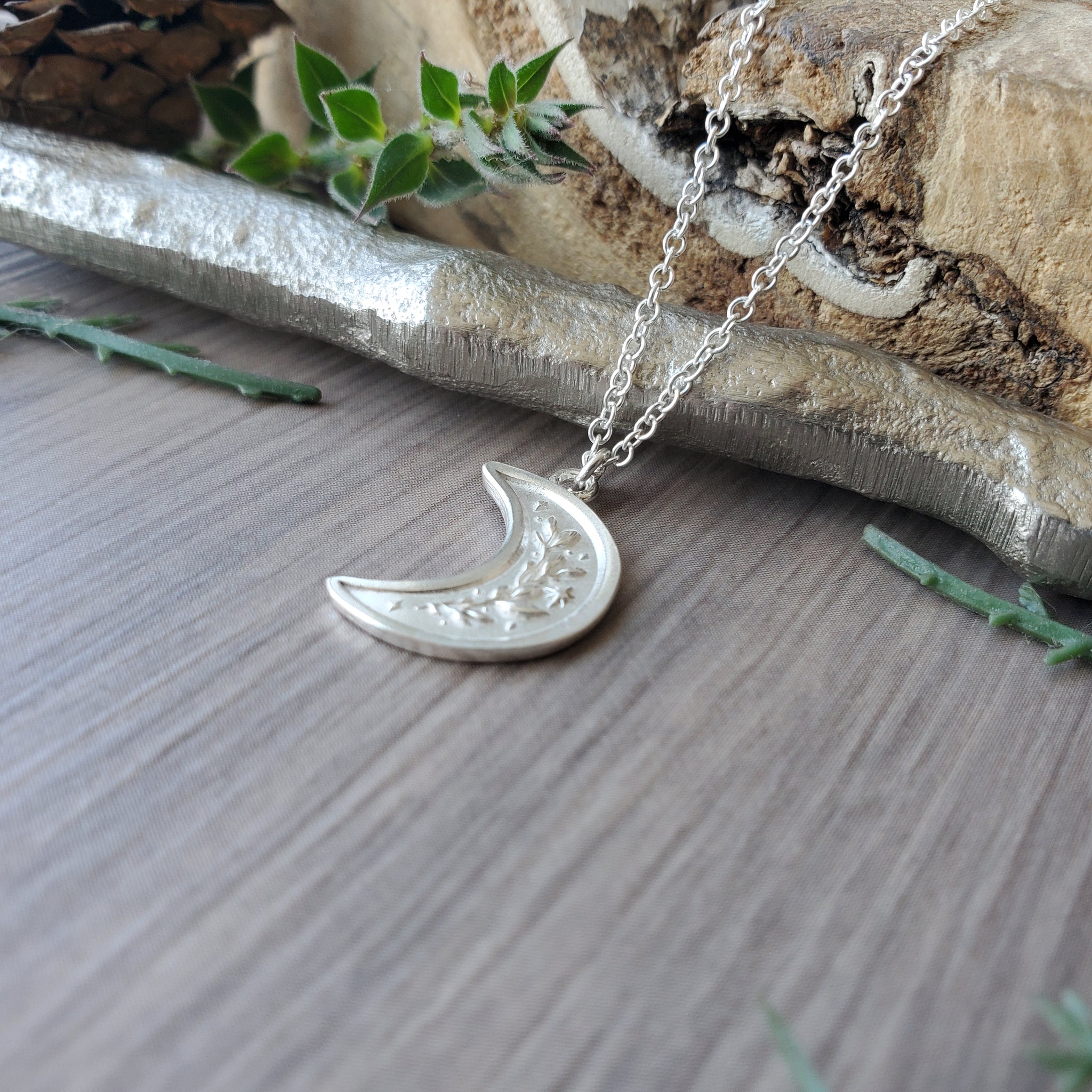 The floral moon necklace is a nature-inspired jewelry piece that beautifully combines the elegance of a sterling silver chain with a delicate floral crescent pendant, designed to bring a touch of the starry night to your everyday look. This hand-stamped necklace features a 20x8mm sterling silver crescent moon pendant, crafted to capture the waxing crescent phase with intricate floral details that symbolize growth and new beginnings. Wearing this sterling silver necklace offers a unique blend of boho crescent necklace style and timeless silver moon jewelry, perfect as a moon jewelry gift or a personal treat.
