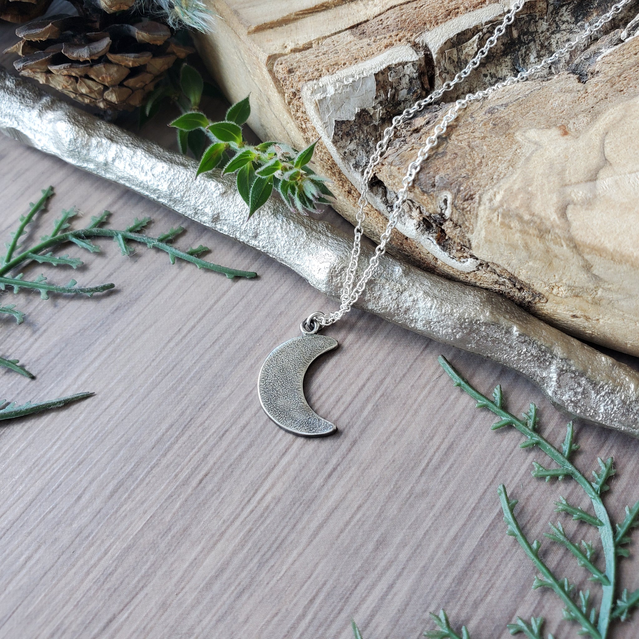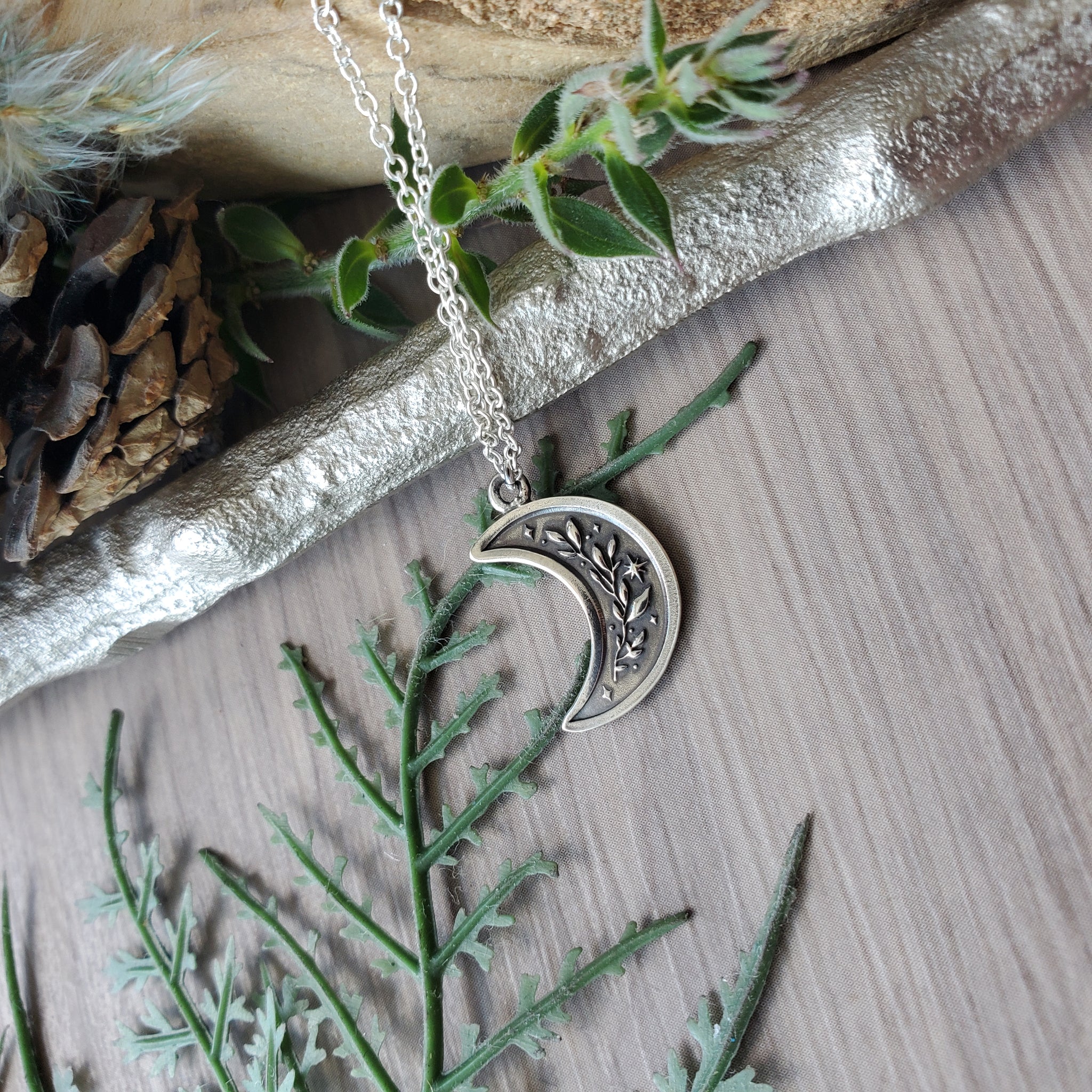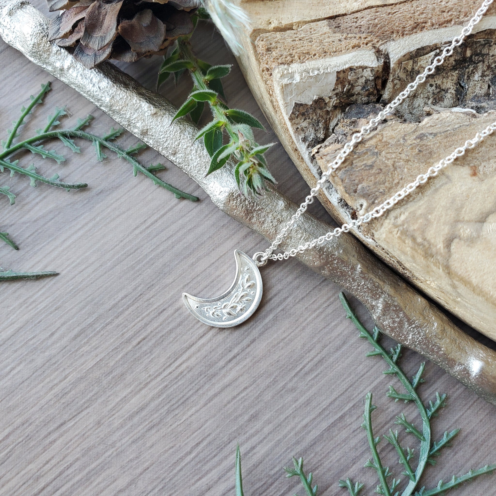 The floral moon necklace is a nature-inspired jewelry piece that beautifully combines the elegance of a sterling silver chain with a delicate floral crescent pendant, designed to bring a touch of the starry night to your everyday look. This hand-stamped necklace features a 20x8mm sterling silver crescent moon pendant, crafted to capture the waxing crescent phase with intricate floral details that symbolize growth and new beginnings. Wearing this sterling silver necklace offers a unique blend of boho crescent necklace style and timeless silver moon jewelry, perfect as a moon jewelry gift or a personal treat.