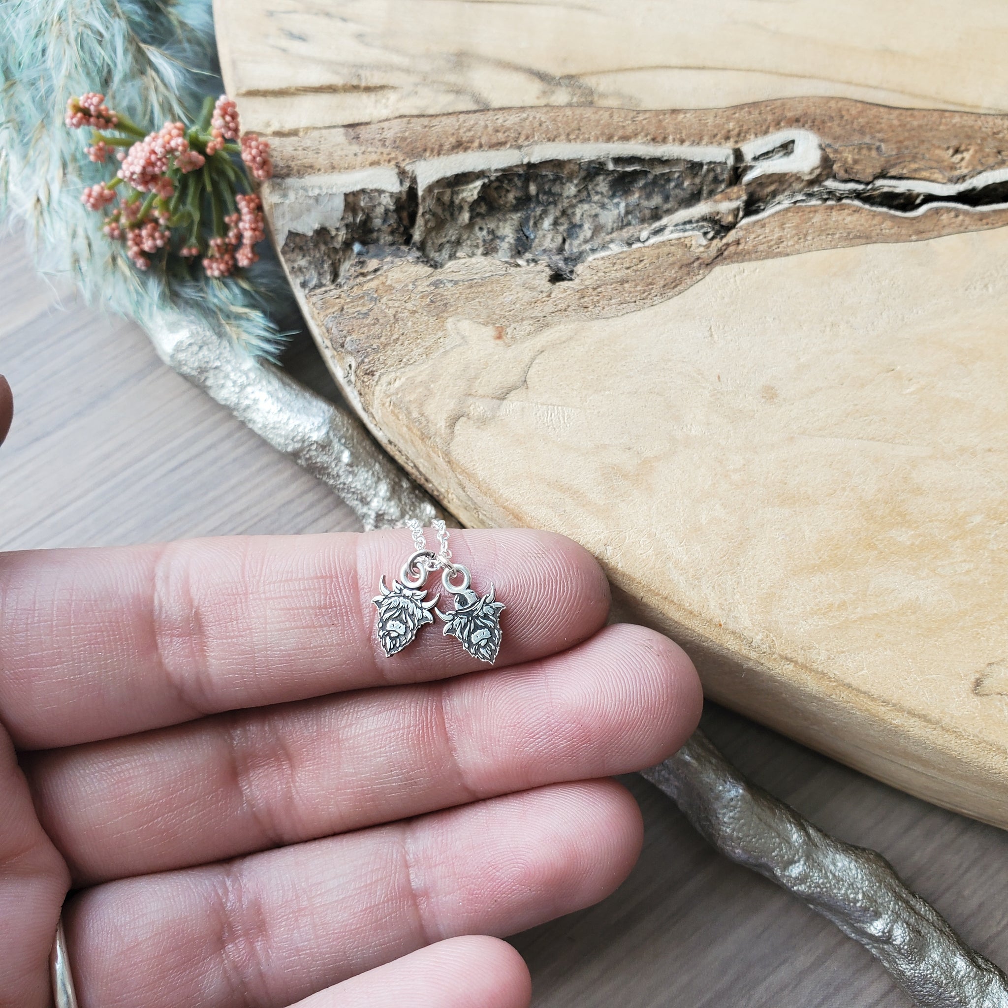 A pair of tiny minimalist Sterling Silver 11x8mm Highland Cow charms on a Sterling Silver chain.