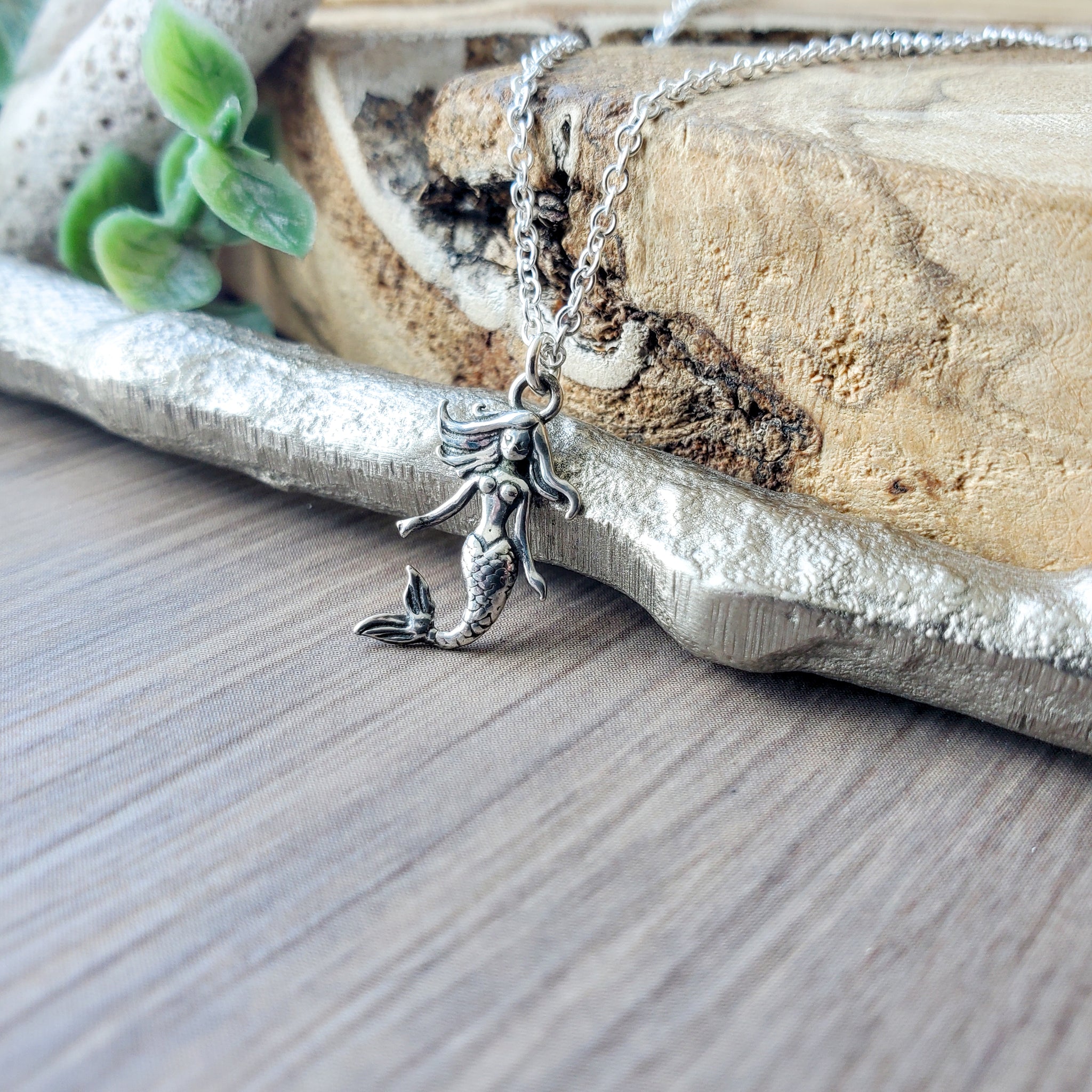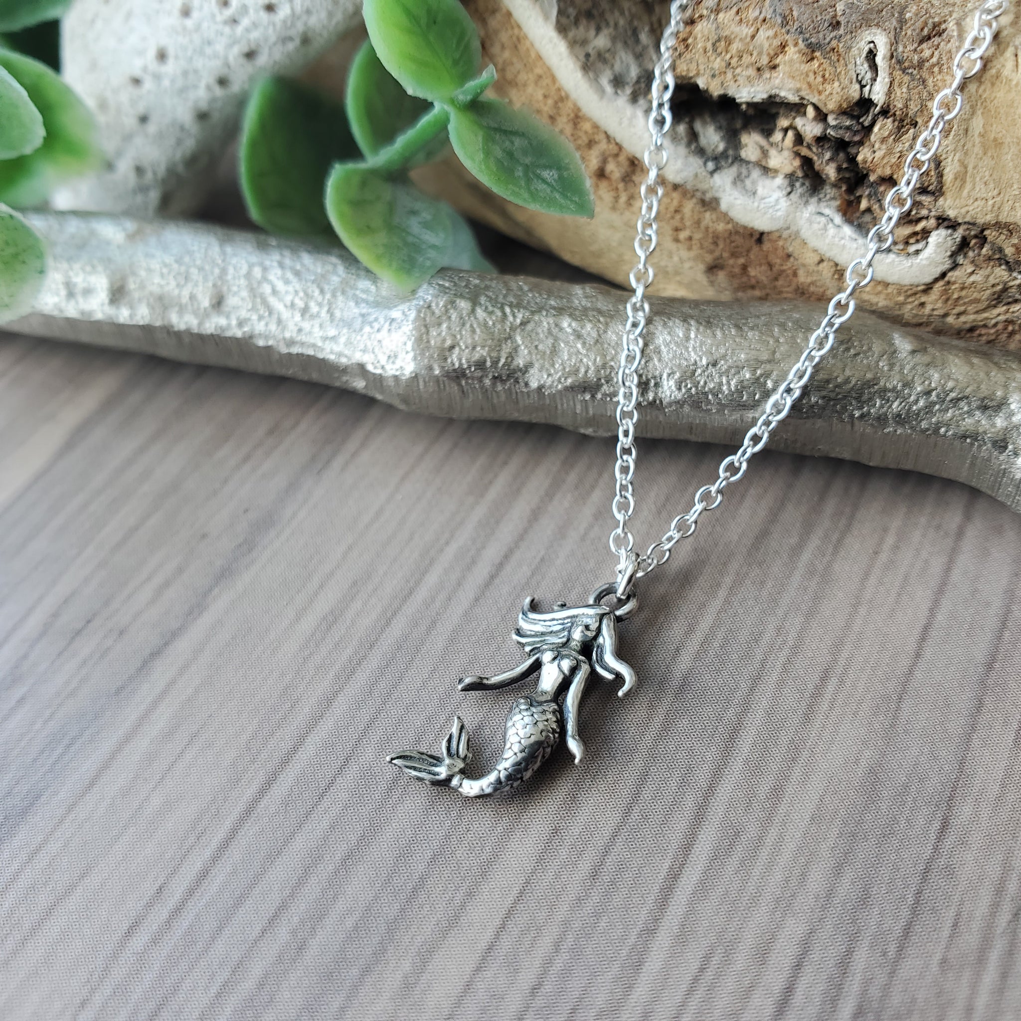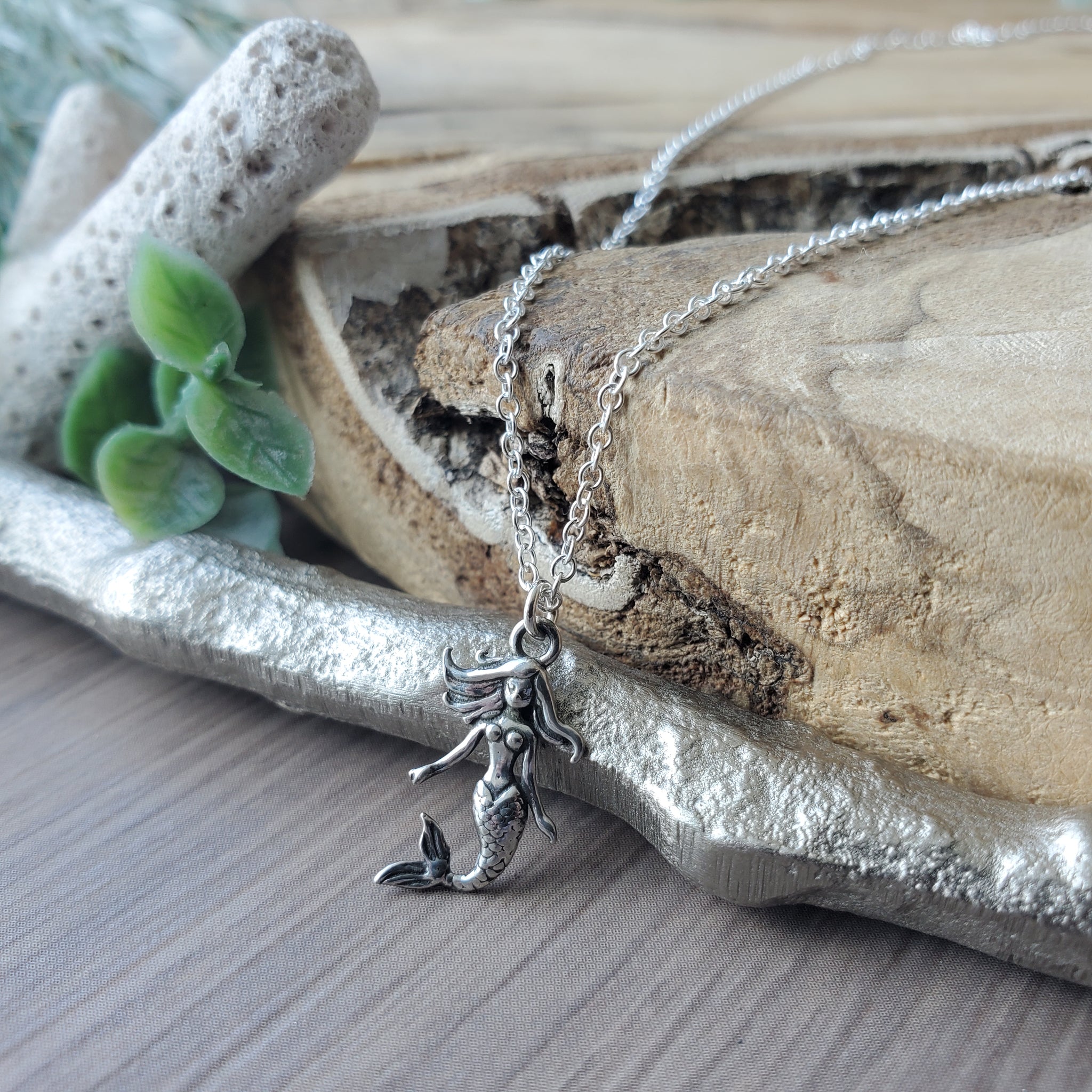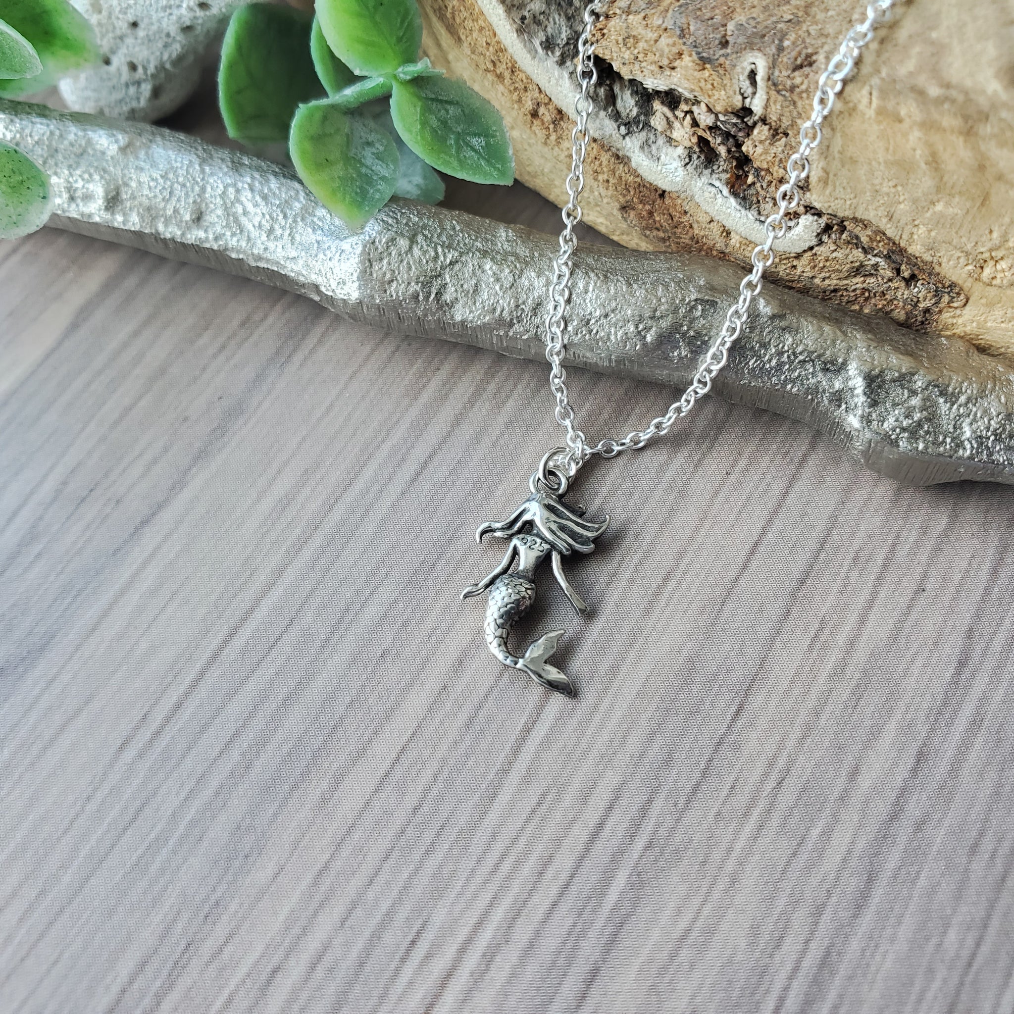A Sterling Silver chain with a tiny 3D 17x9.5mm Sterling Silver Mermaid pendant.