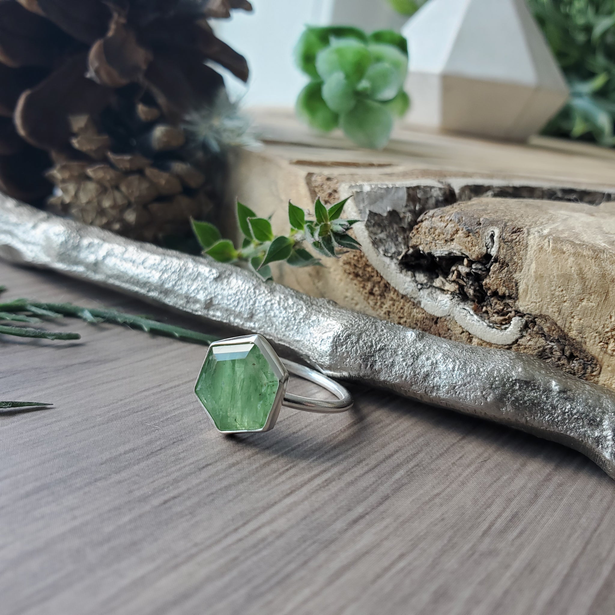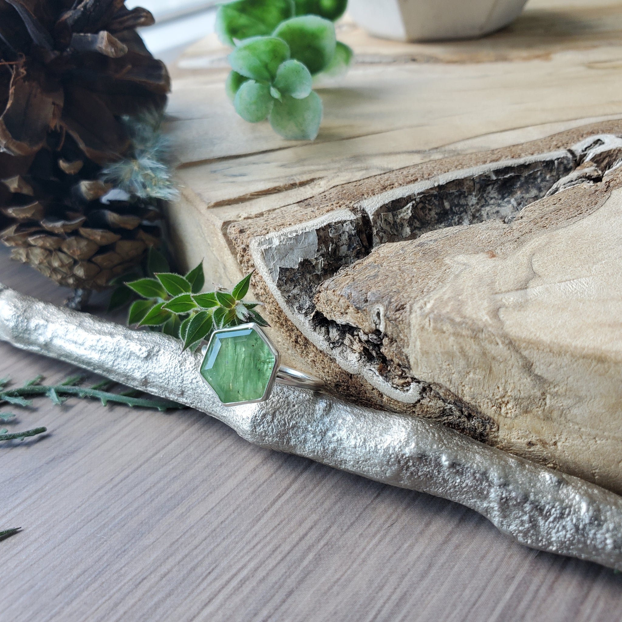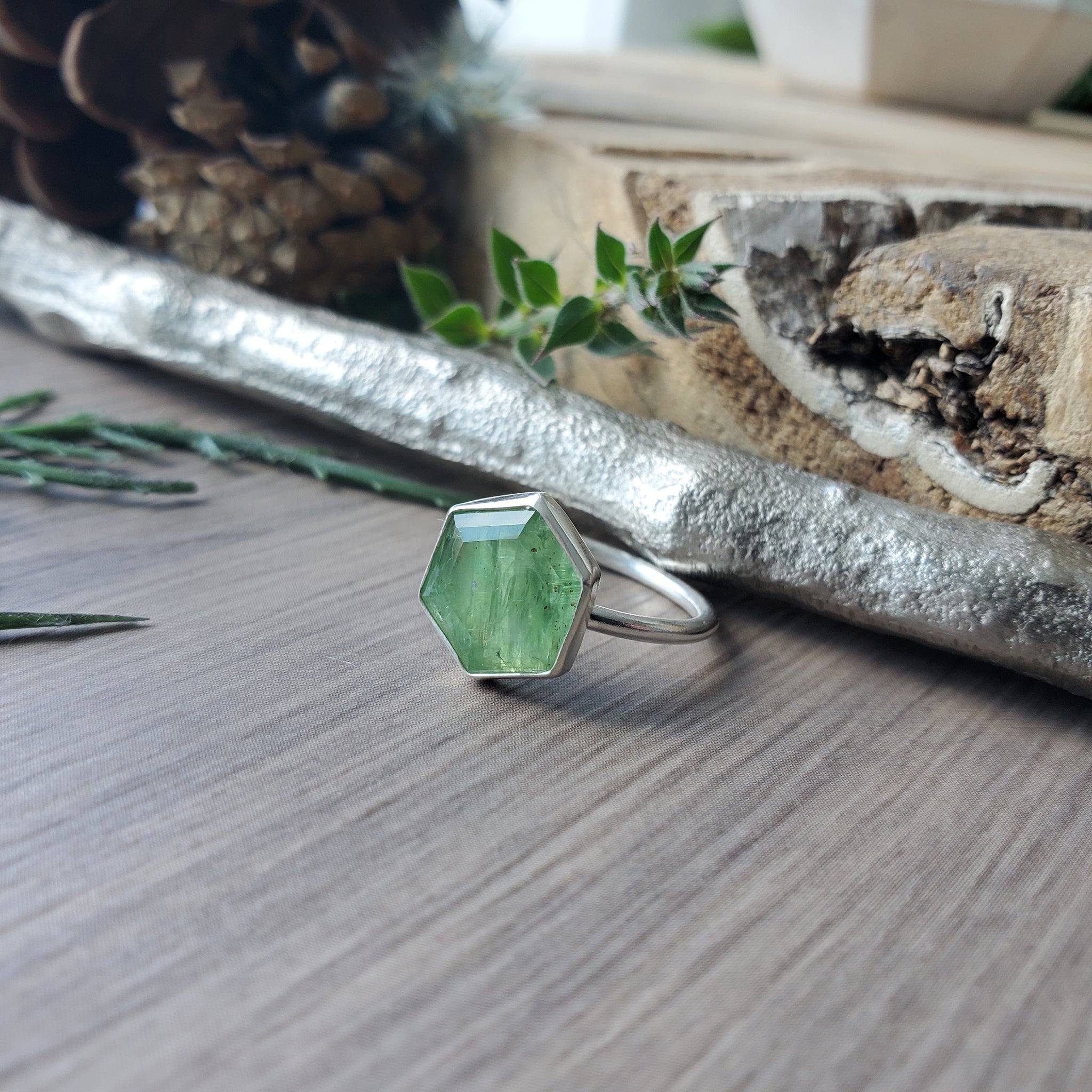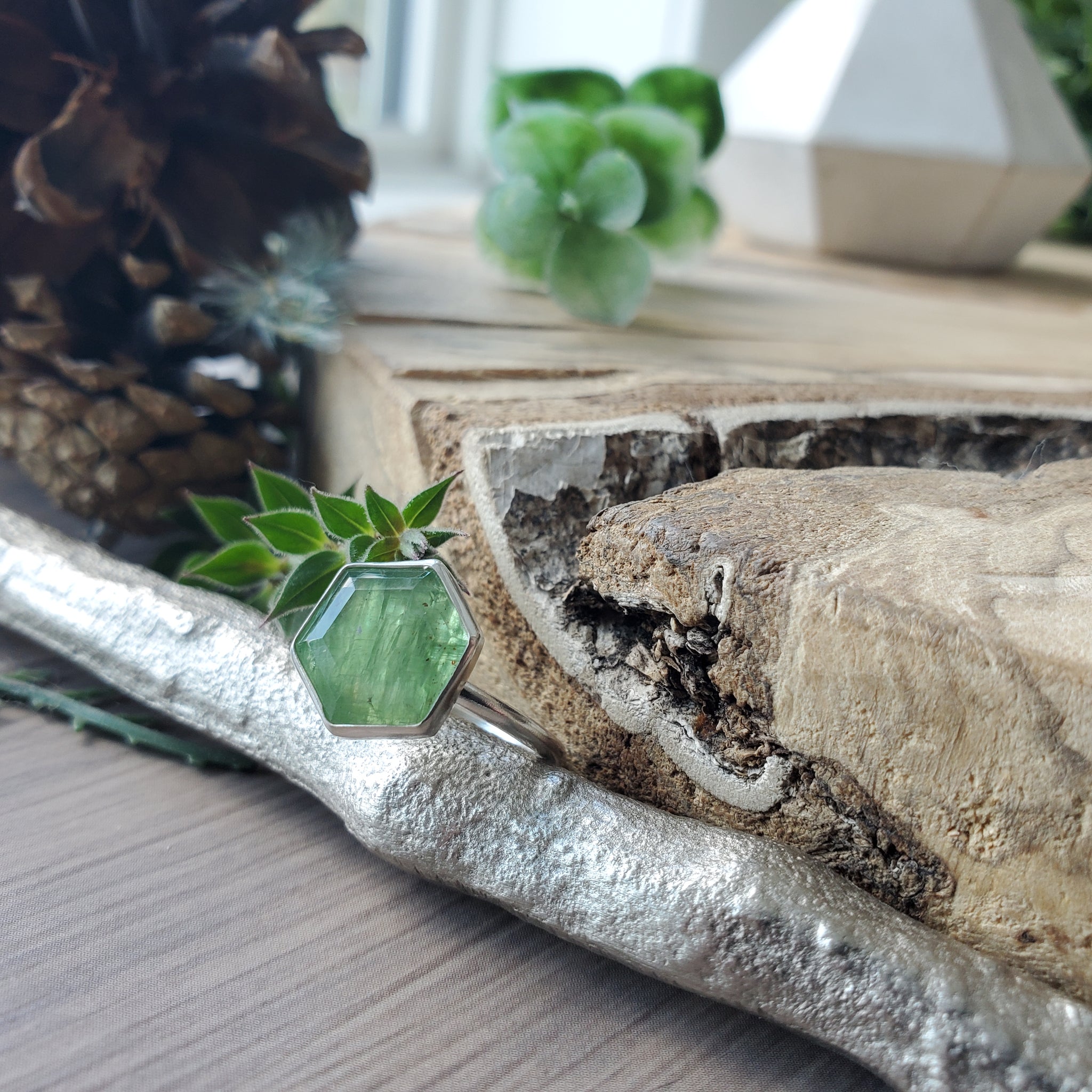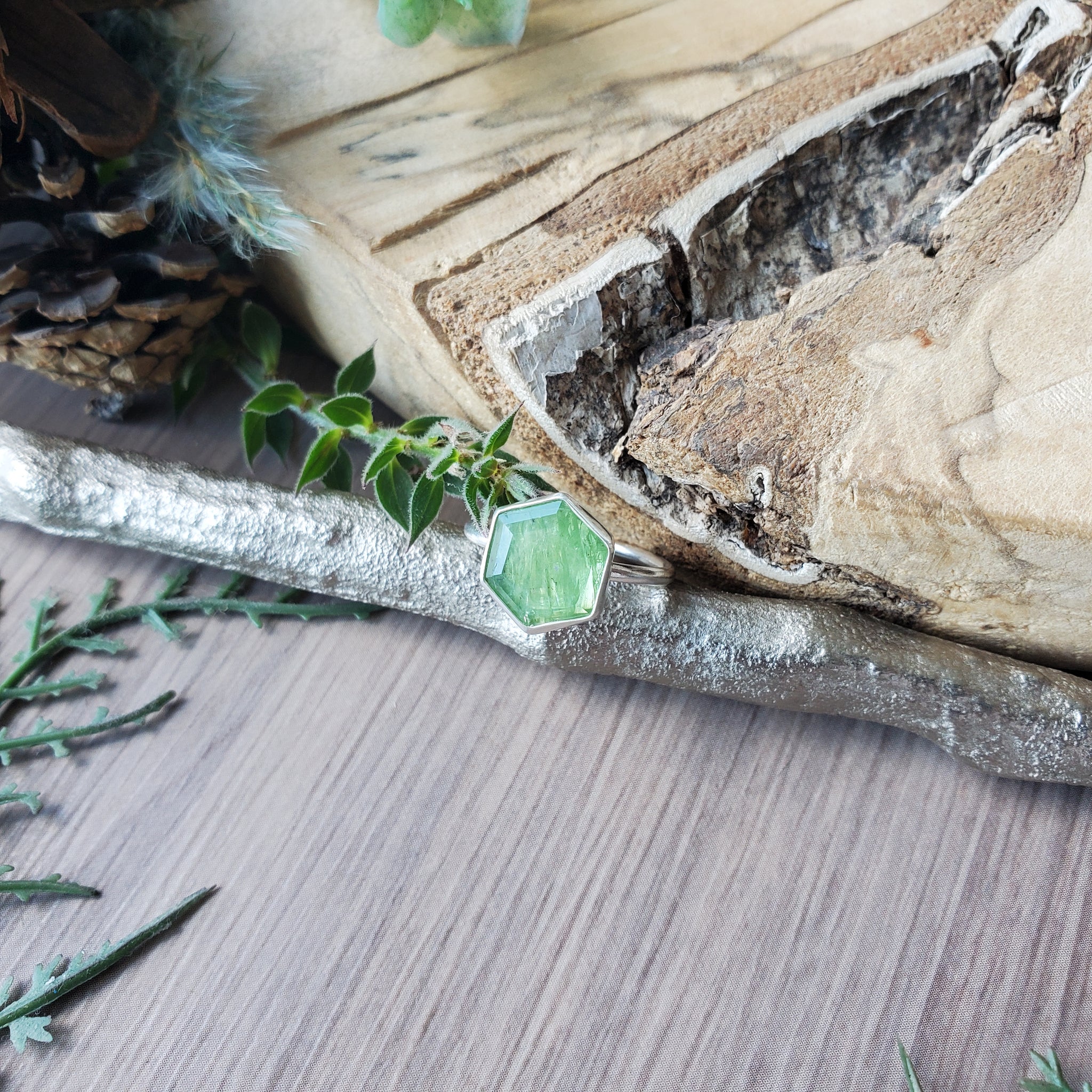 The Moss Kyanite Ring is a beautifully crafted Sterling Silver ring featuring a faceted 10x12mm Green Moss Kyanite gemstone in a unique hexagon shape. Designed for stacking or wearing alone, this handmade gemstone ring delivers a natural and elegant look that enhances any jewelry collection. The Moss Kyanite Ring offers a mint green jewelry option sourced from Madagascar, known for its distinct color and texture. Each natural stone varies slightly, ensuring your ring is truly one-of-a-kind.